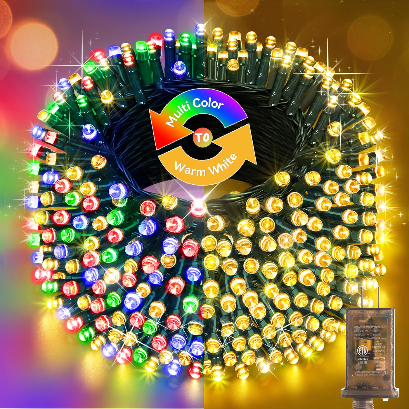 Hezbjiti 1000LED Color Changing Christmas Lights, 403FT Green Wire, IP44 Waterproof, Warm White & Multicolor, 11 Modes