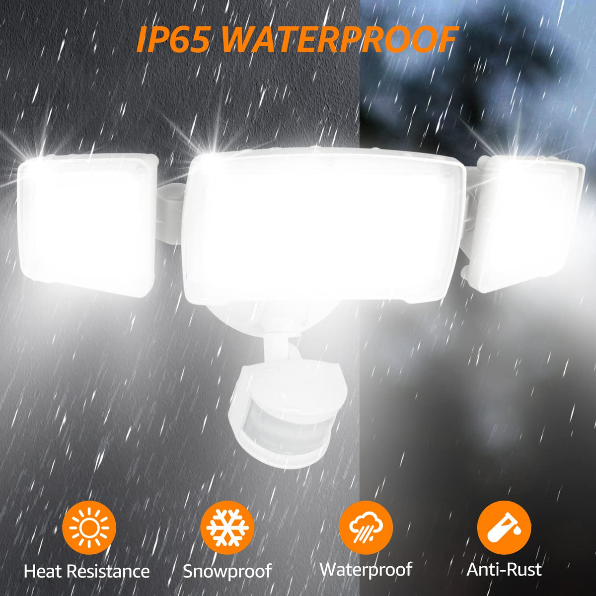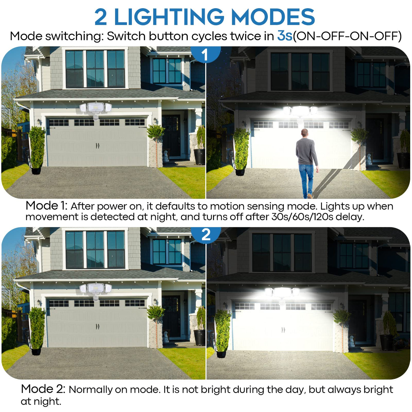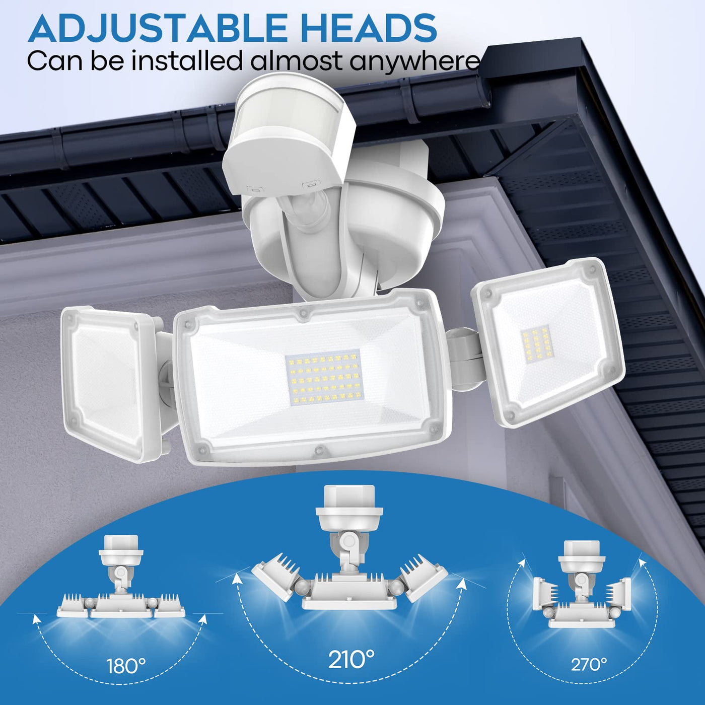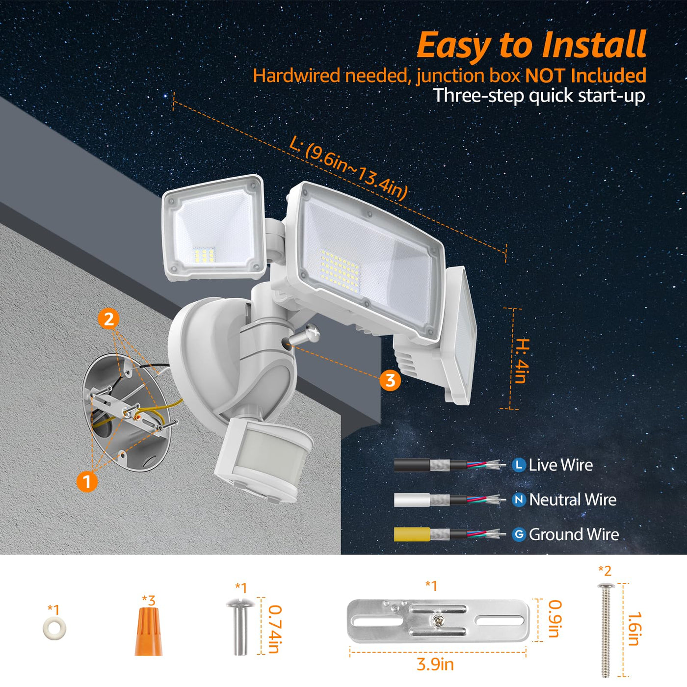 - **Adjustable Installation**: Easily mount the floodlight with adjustable lamp heads and motion sensor angles. This flexibility allows for customized positioning to maximize light coverage in your garage, porch, yard, or any outdoor area.
