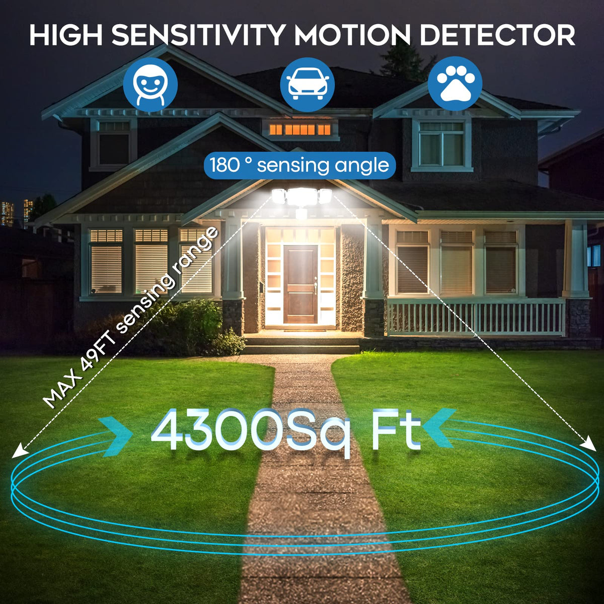 Q: How does the motion sensor work on these outdoor lights?A: These outdoor lights are equipped with a sensitive motion sensor that detects movement up to 49 feet away. When movement is detected at night, the lights automatically turn on, providing enhanced security for your home.