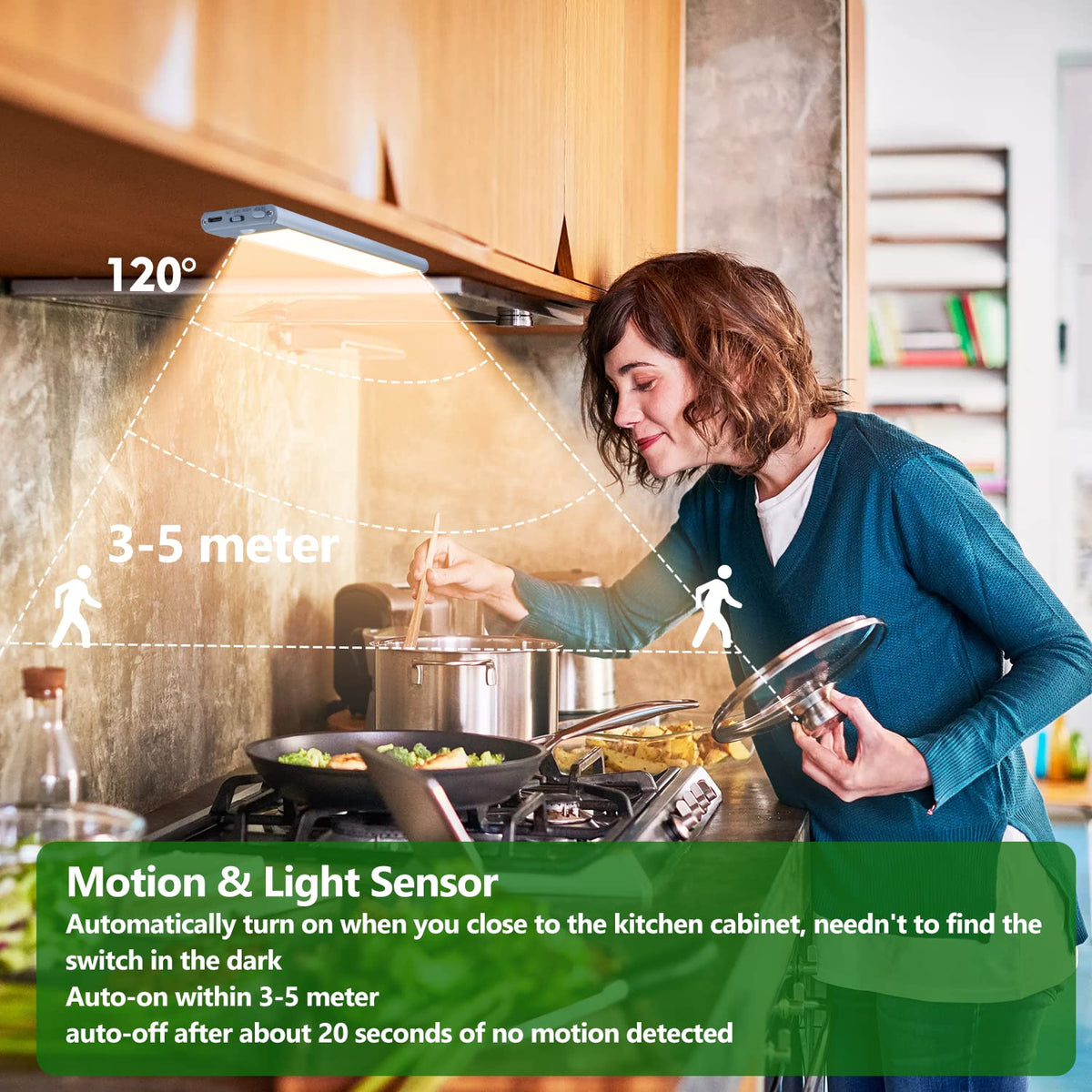 Q: How does the motion sensor work in the HIBOITEC Under Cabinet Lights?A: The motion sensor in the HIBOITEC Under Cabinet Lights has three working modes: always on, off, and sensor mode (G mode). In sensor mode, the light automatically turns on when it detects human motion within 10 feet in a dark environment and turns off after 20 seconds of no motion, providing convenience and energy efficiency.