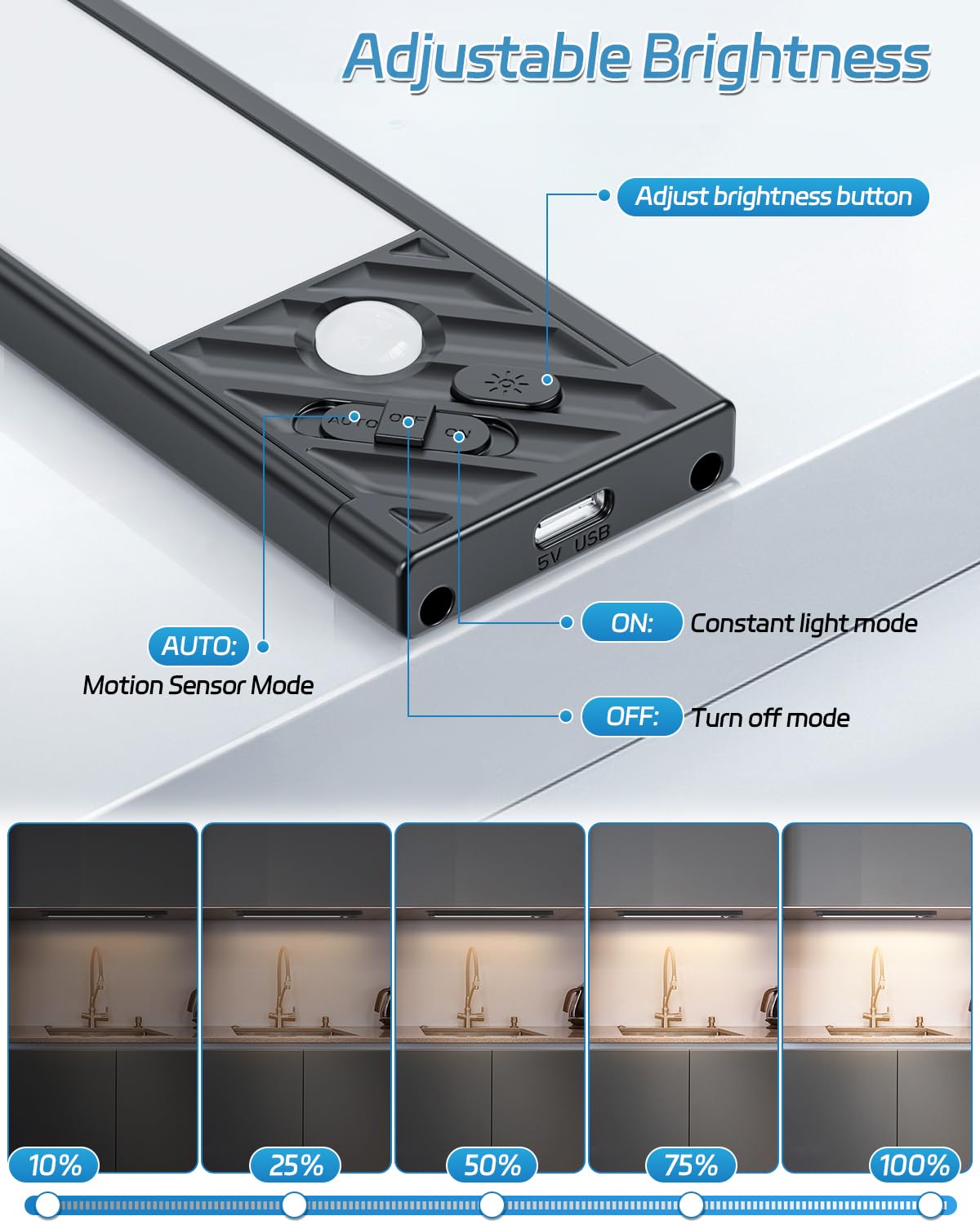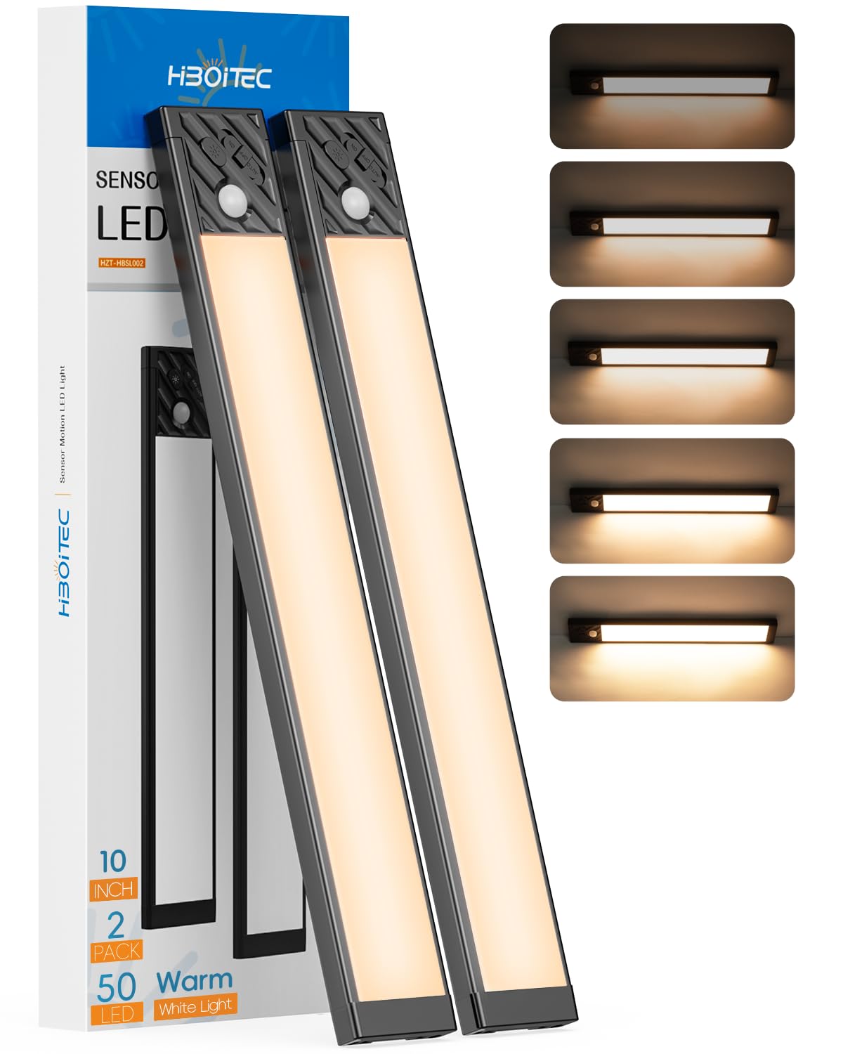 -About HIBOITEC Under-Counter Light Fixture -More Brightness: With 50 LEDs, up to 200 lumens, more bright than other fewer LEDs counter lights. -Larger Batter Capacity: Built-in 1500mAh rechargeable battery, larger battery capacity than other tap closet lights. -Longer LED Life: LED Life expectancy of more than 80000 hours, longer than other 50000 hours LED closet lights. -Two Modes Adjustable: On/ Off & Motion Sensor Mode. -USB Rechargeable: Using rechargeable design, easily charged via usb cable. No longer use AAA battery. -Stick on Anywhere: Using the magnetic back design, can stick on any iron product. -Wide Applications: Ideal for cabinets, closets, basements, stairwells, indoor garages, and so on.