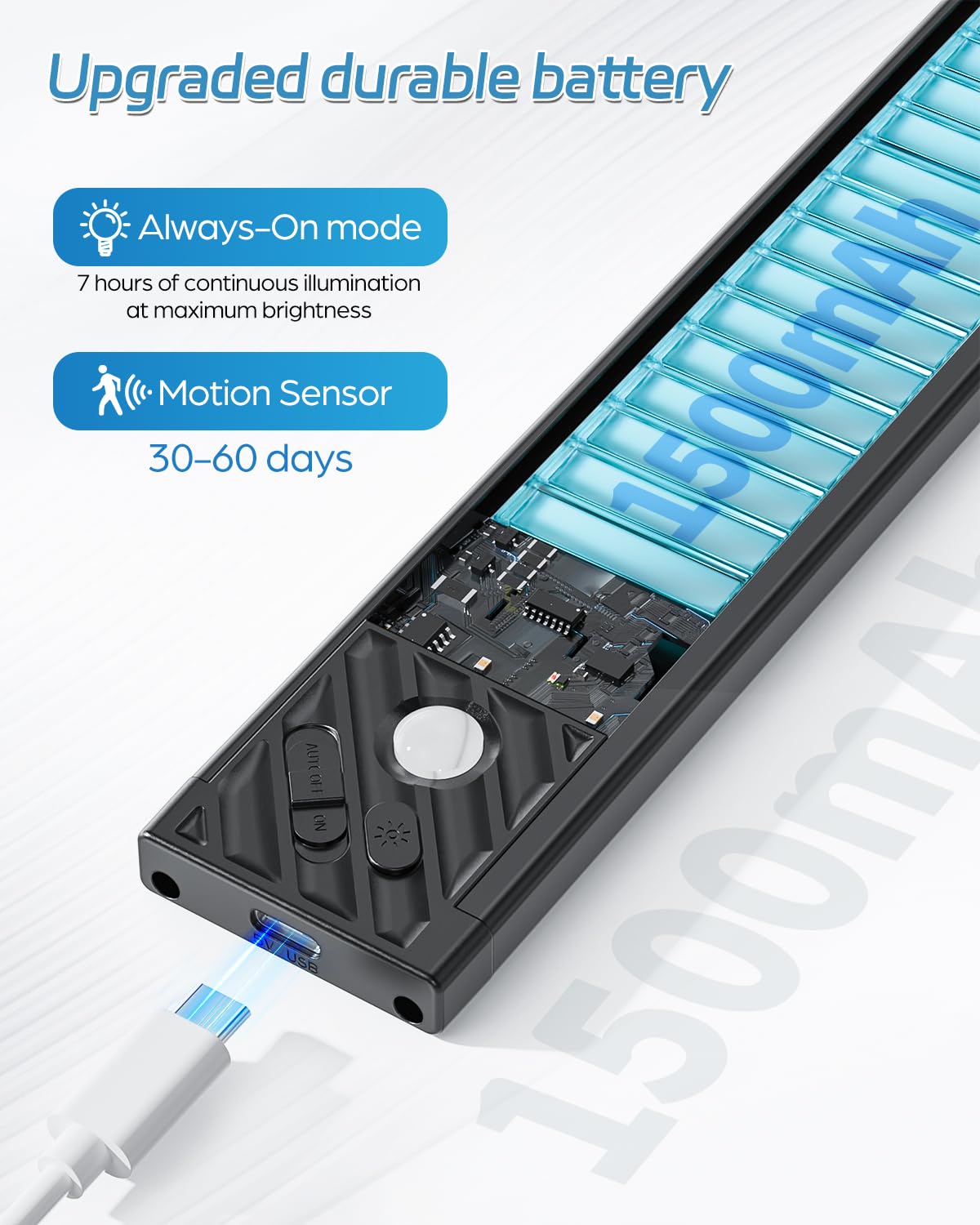 Q: What is the battery life of the rechargeable closet lights?A: These lights are equipped with a 1500mAh rechargeable battery. In motion sensor mode, they can last between 7 to 30 days on a full charge, depending on usage. In always-on mode, they provide continuous lighting for up to 7 hours.