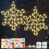 Christmas is coming soon, light up your windows with this snowflake window silhouette, you can use it to decorate your windows throughout the winter season or use at any winter themed event. Specification: Size: 12 inch in diameterLED color: warm whiteLED quantity: 70 LEDsPower Supply: 3AA batteries poweredOperation: round button on battery boxSettings: 8 modes (flashing, waves, combination, sequential, slow glow, chasing, slow fade and steady on)Package includes: 2 x Christmas window lights2 x Suction cup hook18 count Foil Christmas stickersWinding risk may exist, please keep our product away from children.