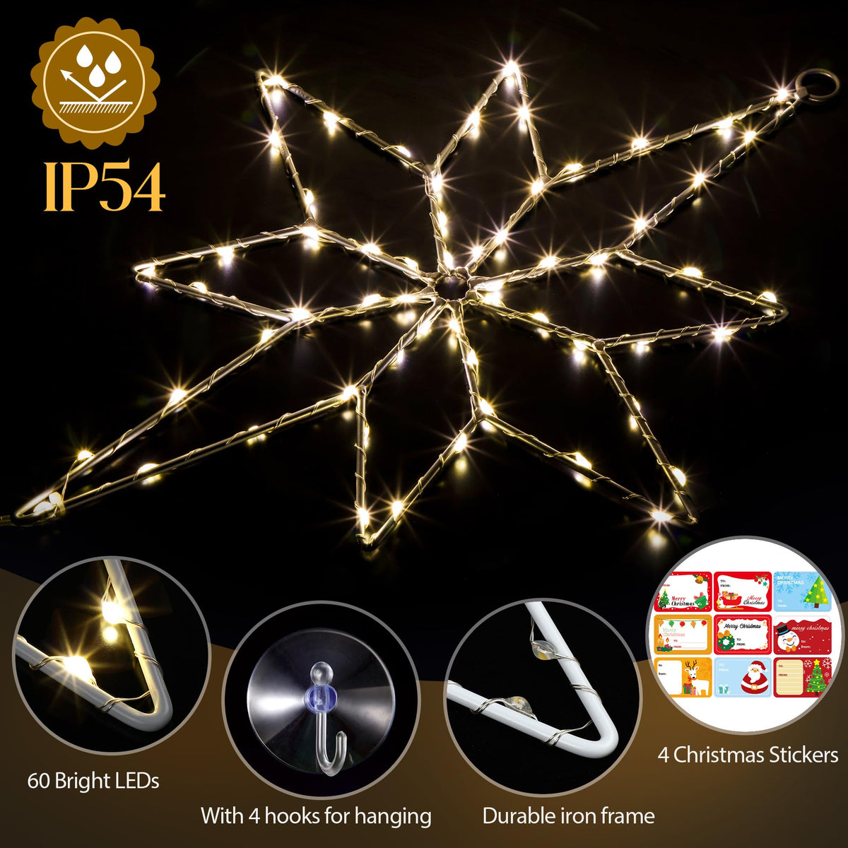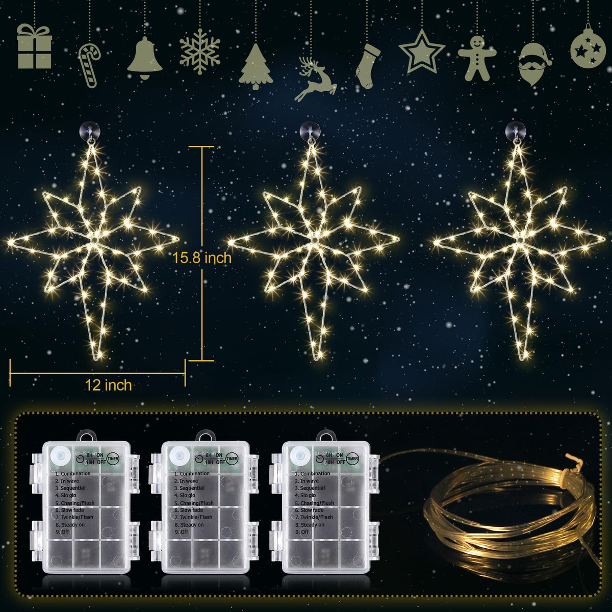 Christmas is coming soon, light up your windows with star window, you can use it to decorate your windows throughout winter or use at any winter themed event. Lighted Christmas window decorations indoor: This LED lighted star Christmas window decoration includes 1 piece design with 70 white lights on white wire, Battery box control, Christmas stickers and suction cup. Specification: Size: 12 inches in diameter LED color: warm white LED quantity: 70 LEDs per pack Operation: round button on the battery box to adjust the light mode and timer Settings: 8 modes (flashing, waves, combination, sequential, slow-glow, chasing, slow fade and steady on) Package includes: 3 x Snowflakes Christmas lights 1 x Battery box 3 x 9 count foil Christmas stickers 3 x Suction cup hook Warm tip: 1. Please do not use it in rain or snow 2. Please do not wash with soap, wipe gently with a dry cloth