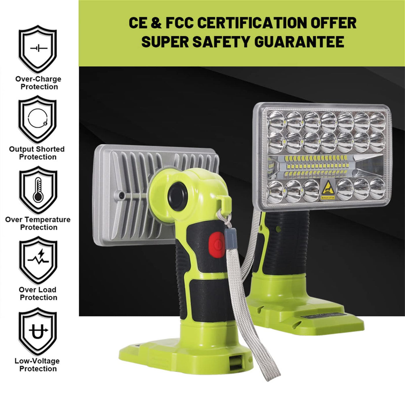Hiesuan Cordless Handheld Spotlight 18W 2000Lm Lithium-Ion Led Work&Nbsp; Light For Ryobi 18V Batteryspecification:&Nbsp;&Nbsp; Material: Plastic & Zinc Alloy Rated Voltage V = 18V Lighting Time:&Nbsp;52Min/Ah(All Lights Mode&Nbsp;) Power: 18W Luminous Flux Lm:2000 Certification: Ce &Amp; Fcc Battery Compatibility: For&Nbsp;Ryobi 18V Lithium Ion Batteries P104 P105 P102 P103 P107 P109 P108 P100 P122 P190 And More.Our Advantages: Wireless Led Work Ligth With A Portable Wrist Strap Makes It Easy To Carry. Perfect For Outdoor Camping, Hiking, Fishing, Hunting, Power Failured Etc. 110-Degree Pivoting Head Provides Versatility For Lighting Work Surfaces. Light To Be Projected In Multiple Directions. Equipped With Over-Load, Over-Current, Over-Heat And Low-Voltage Protection.3&Nbsp; Mode Settings: Short Press Switch Button The 1St Time, The Middle Row Of Led Lights Will Be Lit.&Nbsp; Short Press The 2Nd Time, The Middle Row Of Led Lights Are Off, And The Led Lights On Both Sides Are Lit. Short Press The Third Time, All The Led Lights Are Lit. Long Press To Turn Off The Lightpackage Included:&Nbsp; 1 * 18W 2000Lm Led Work Light For Ryobi 18V Battery(Battery Not Included)