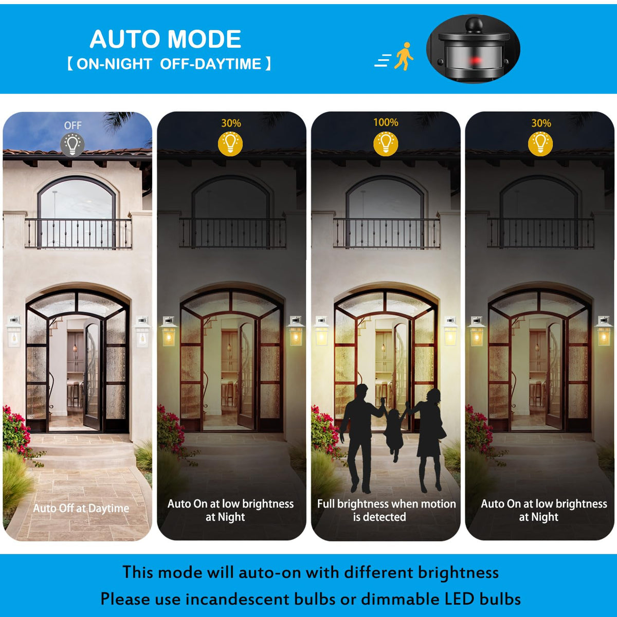 Creative Motion Activation: Automatically turns on at sunset with a 30% dim light, increasing to 100% brightness when motion is detected.