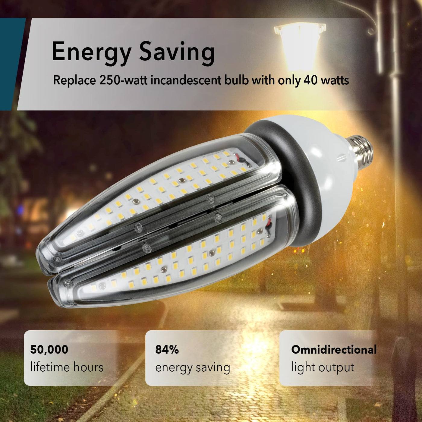 Impressive Brightness: Emitting 5200 lumens, these LED bulb shine 6 times brighter than a traditional 60W bulb, perfect for illuminating spaces like 2 car garages, barns, workshops, and outdoor light fixtures. | Enhanced Energy Efficiency: Replacing incandescent bulbs with our LED option maximizes energy efficiency by over 80-90% on average, providing the same level of illumination with significantly less power consumption. | Omnidirectional Illumination: Increase light spread and downlighting with our corn cob bulbs and adjustable panel bulbs. With this high-lumen bulb selection, every corner of the room will be covered in a crisp bright light. | Easy to Install: With the E26 Edison base, this bulb screws quickly into standard light fixtures. With no start-up time and very little heat output, you can illuminate your garage, barn, warehouse, basement, workshop, or anywhere that needs lots of bright light. Ideal for residential and commercial applications.