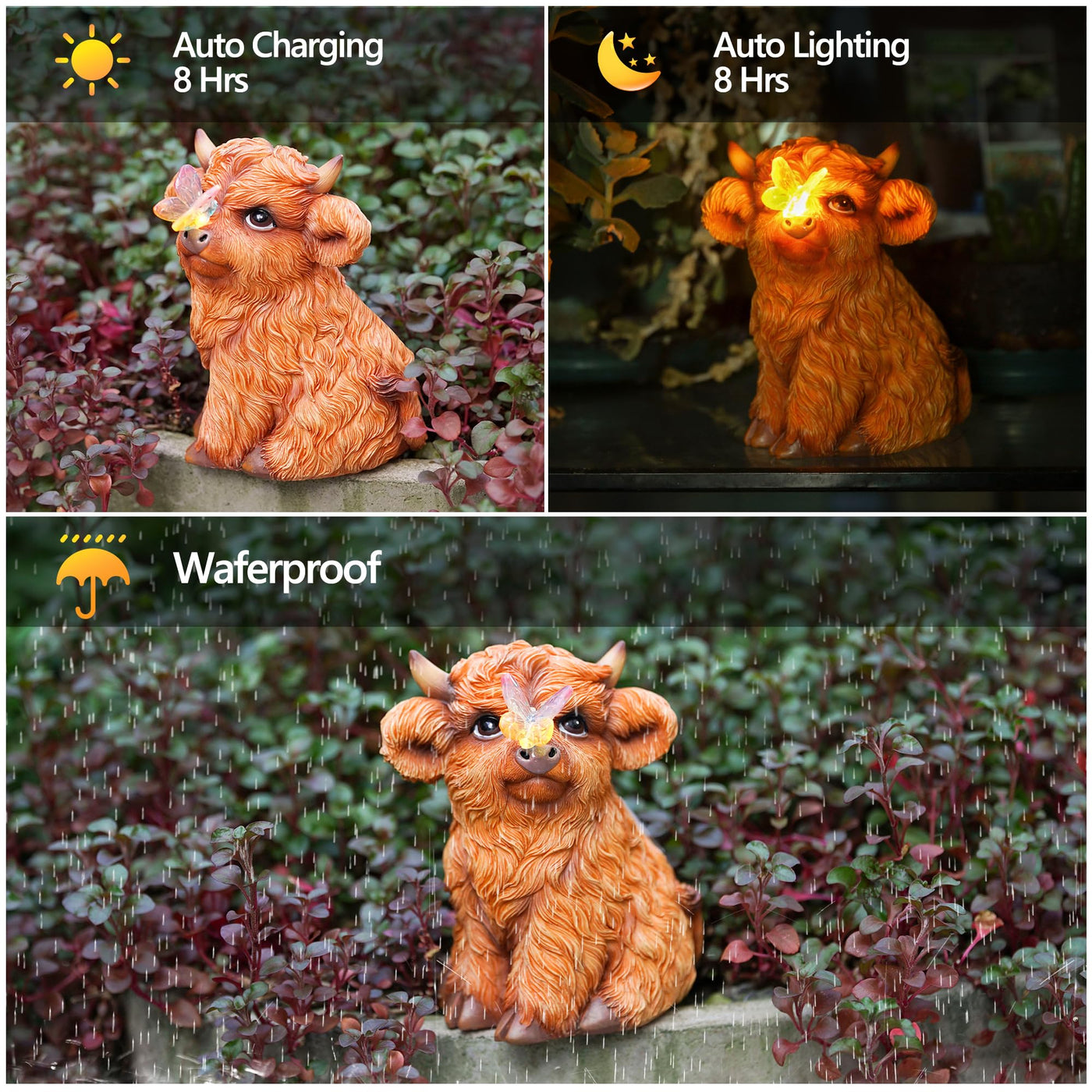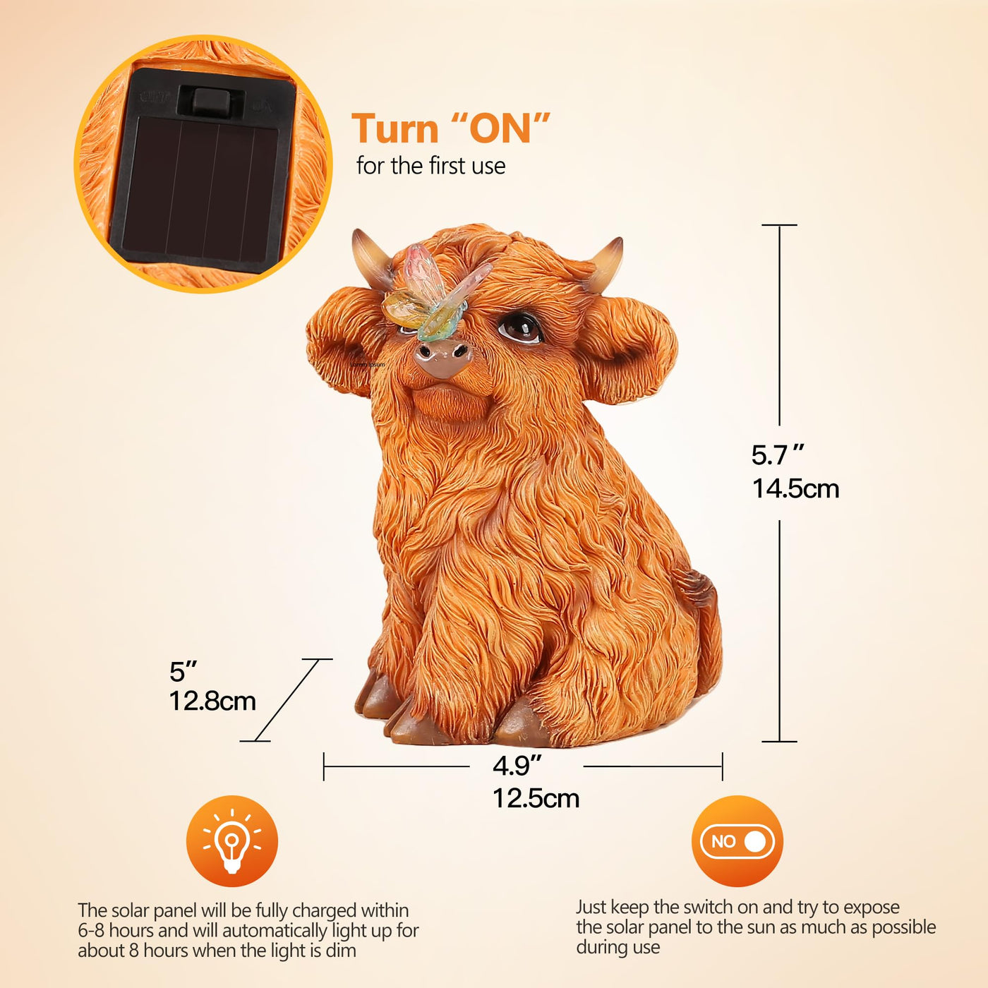 Q: How does the solar-powered feature work in the Highland Cow statue?A: The Highland Cow Solar Powered Outdoor Garden Statue features a solar panel that charges during the day. It absorbs sunlight, allowing the LED light to illuminate automatically at dusk, providing a warm and inviting glow in your outdoor space.