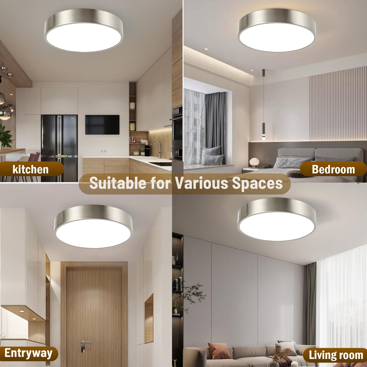 Q: What type of rooms is the Hikaproligt 13inch Modern Nickel Led Flush Mount Ceiling Light suitable for?A: The Hikaproligt flush mount ceiling light is ideal for a variety of spaces including bathrooms, bedrooms, kitchens, hallways, and more, thanks to its elegant design and versatile functionality.