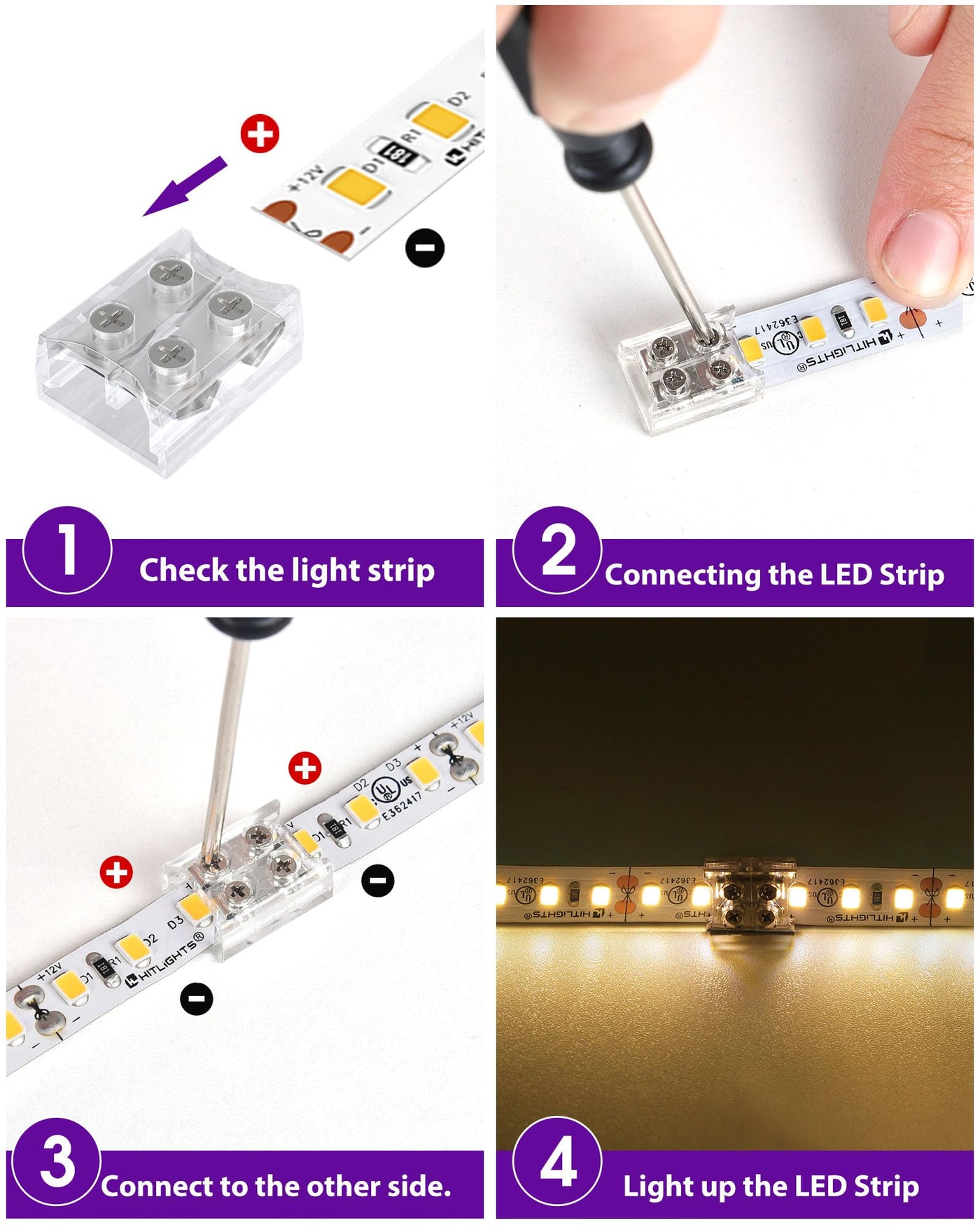Q: How do I install the HitLights solderless LED connectors?A: Installation is simple and requires no soldering. Just plug the LED strip into the connector and tighten the screw using the included screwdriver. Ensure that the positive side of the strip connects to the positive side of the connector for optimal performance.