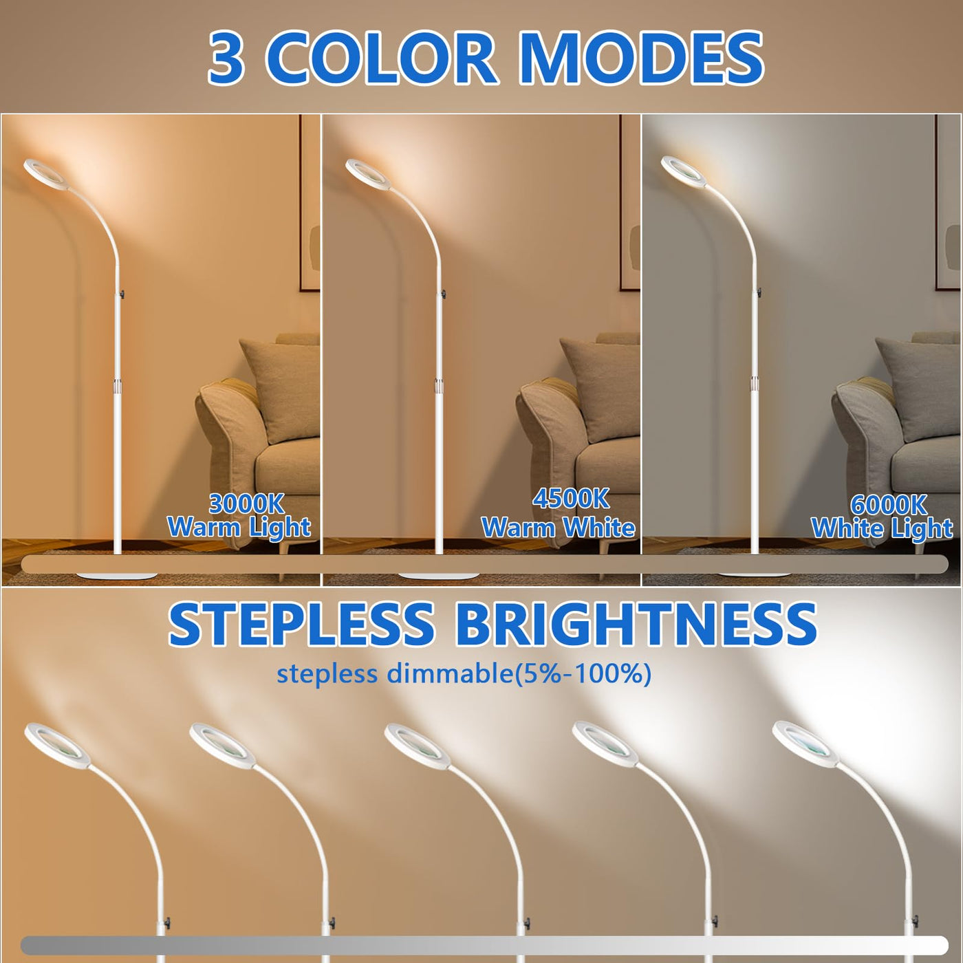 Hitti 10X Magnifying Glass With Light And Clamp, Hands Free Magnifying Floor Lamp With Flexible Gooseneck, 3 Color Stepless Dimm