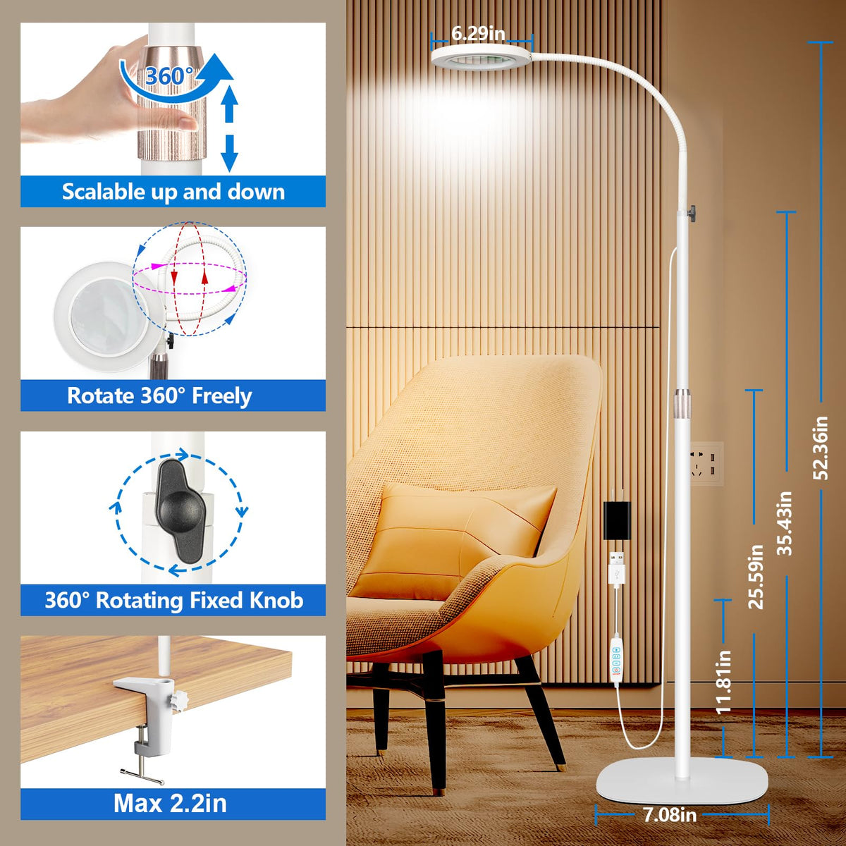 Product Description: Introducing the Adjustable Magnifier Floor Lamp, the perfect tool for those who require crystal clear magnification for various tasks. Whether you're an esthetician, artist, or simply need a magnifying lamp for everyday use, this 2-in-1 magnifying floor and clamp lamp is sure to meet all your needs. Featuring adjustable magnification, this lamp provides crystal clear clarity, allowing you to see even the finest details with ease. The 2-in-1 functionality offers you the convenience of both a floor lamp and a clamp lamp, giving you the flexibility to use it in any way you desire. The flexible and extra-long gooseneck design ensures maximum reach and allows you to position the lamp exactly where you need it. For estheticians, this magnifying lamp is a game-changer. It provides the perfect amount of light and magnification for detailed facial treatments, lash extensions, and other intricate procedures. The bright, yet soothing light ensures optimal visibility, while the magnification helps you achieve precise and accurate results. Not only is this magnifier floor lamp functional, but it also adds a touch of style to any space. Its sleek design blends seamlessly with any decor, making it a stylish addition to your home, salon, or studio. The practicality of this lamp is unmatched, as it combines the benefits of a magnifying glass with light and a stand, giving you the best of both worlds. In conclusion, the Adjustable Magnifier Floor Lamp is a must-have for anyone who requires precise magnification and illumination. Its adjustable features, extra-long gooseneck, and 2-in-1 functionality make it a versatile and practical tool for various tasks. Whether you're a professional or simply need a magnifying lamp for everyday use, this lamp is sure to exceed your expectations.