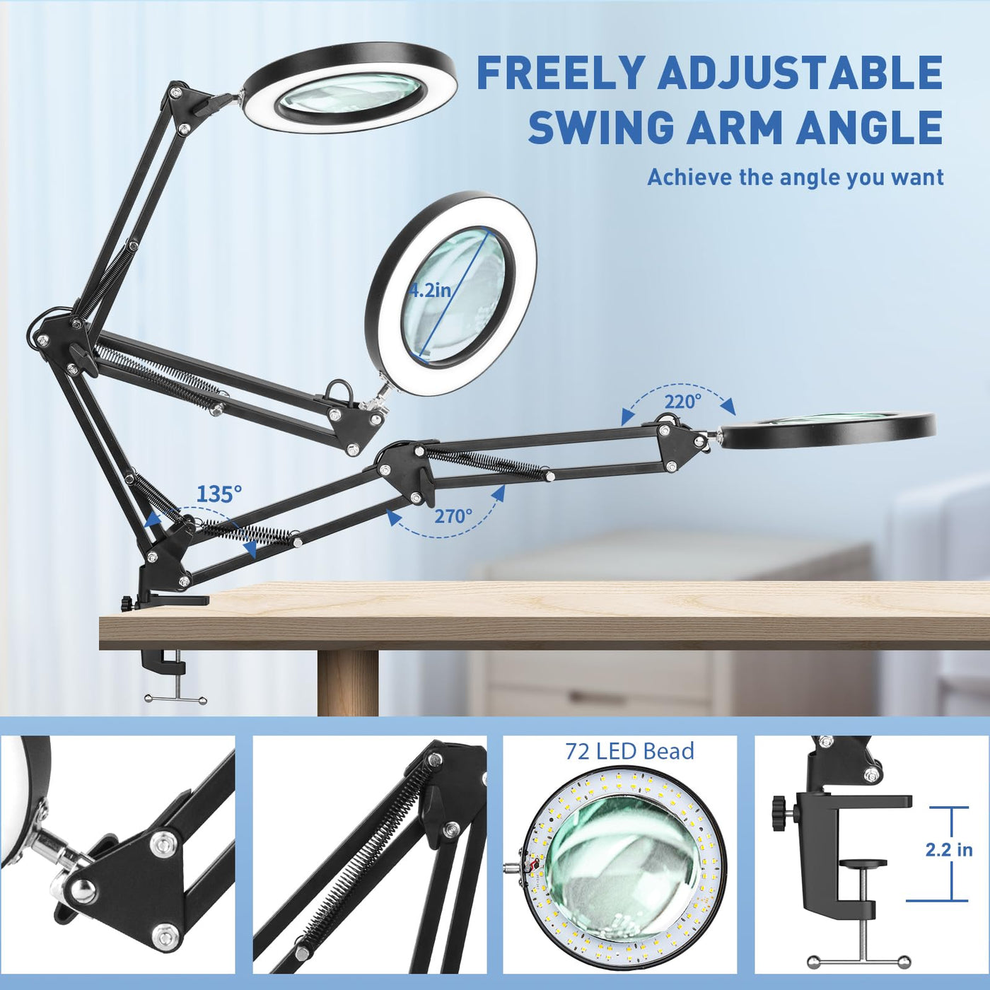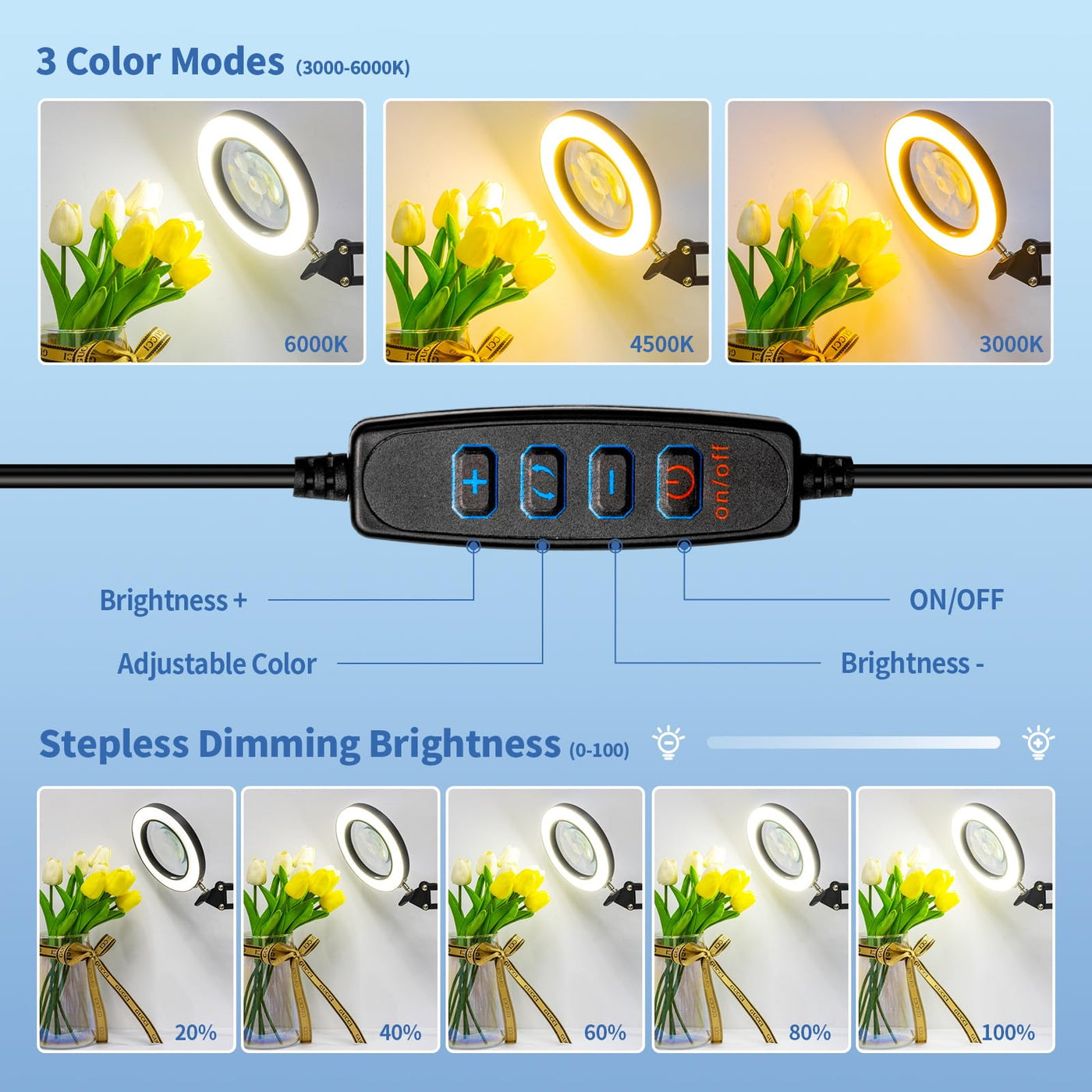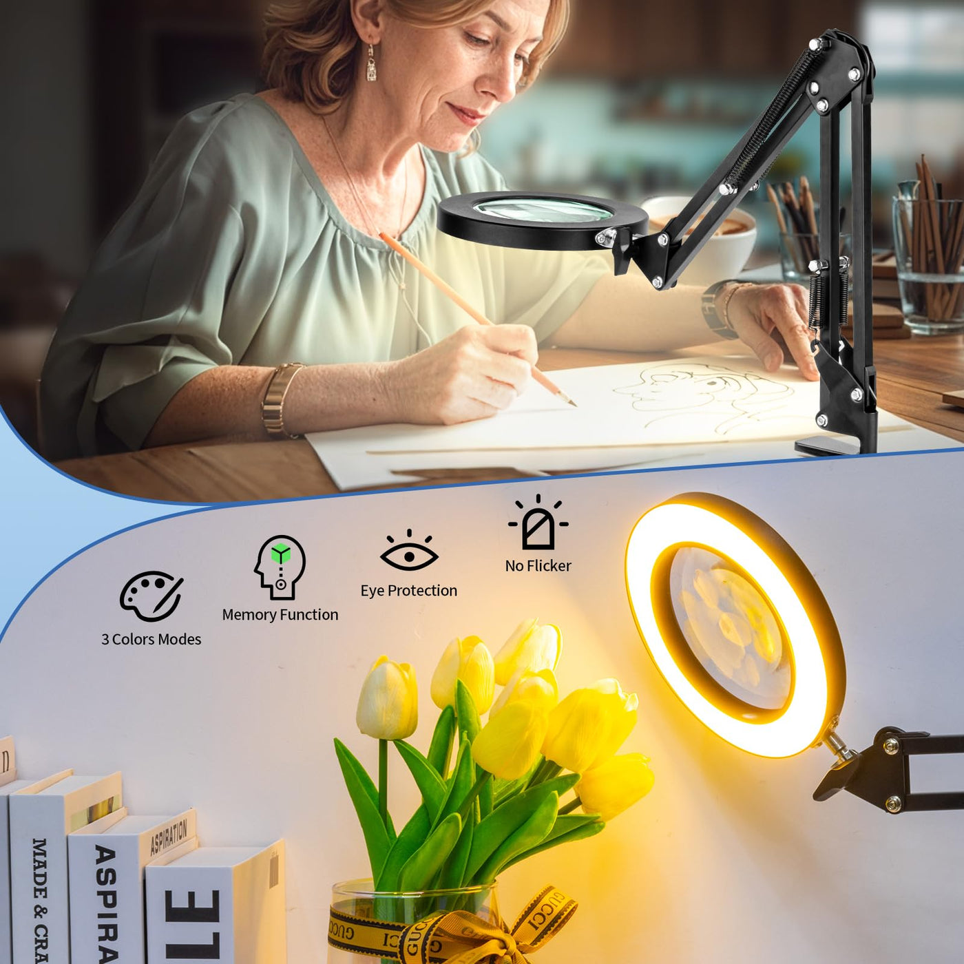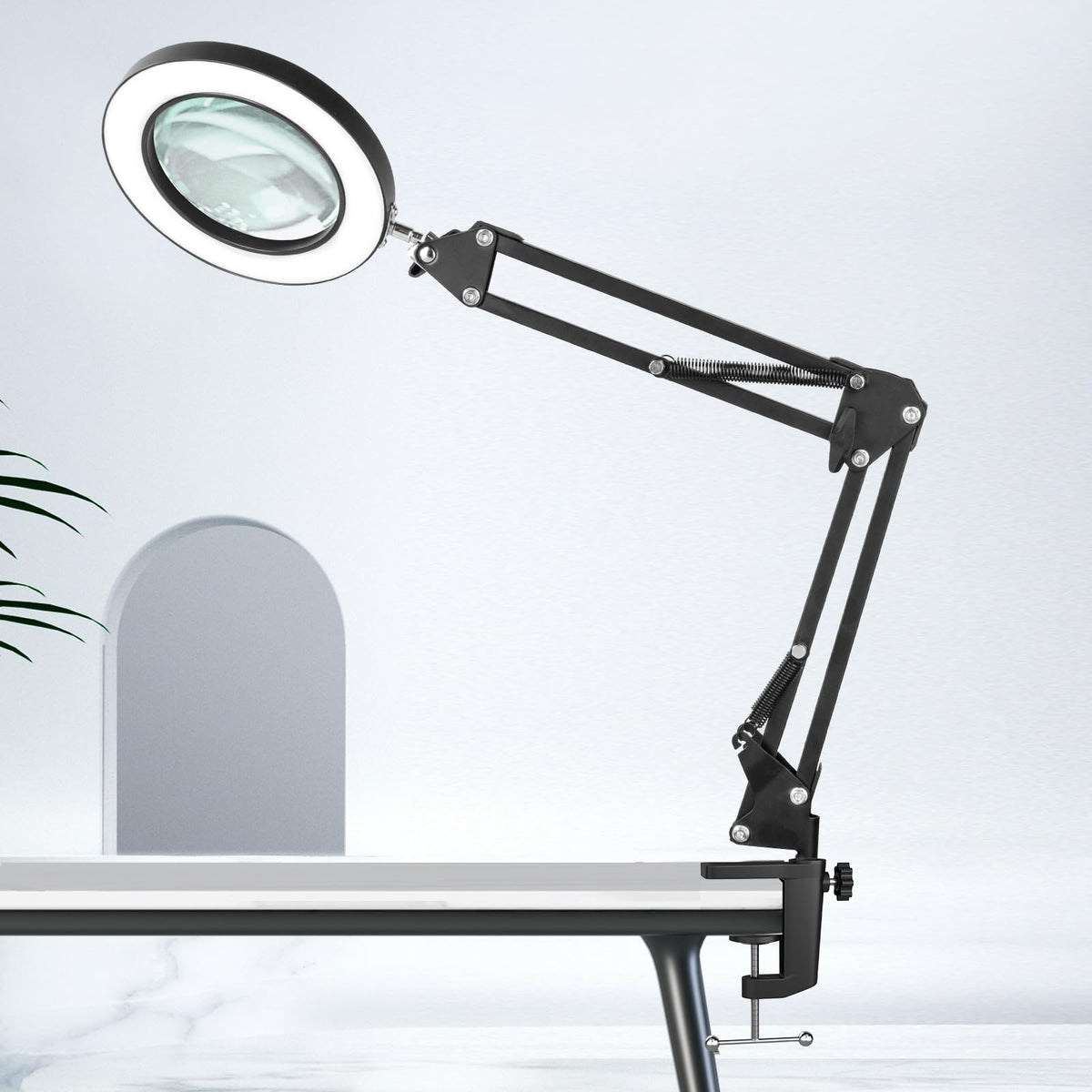 HITTI 10X Magnifying Glass with Light and Stand, Stepless Dimming 3 Color Modes LED Magnifier Lighted Glass, Hands Free Desk Lamp with Clamp for Reading Repair Crafts Close Work