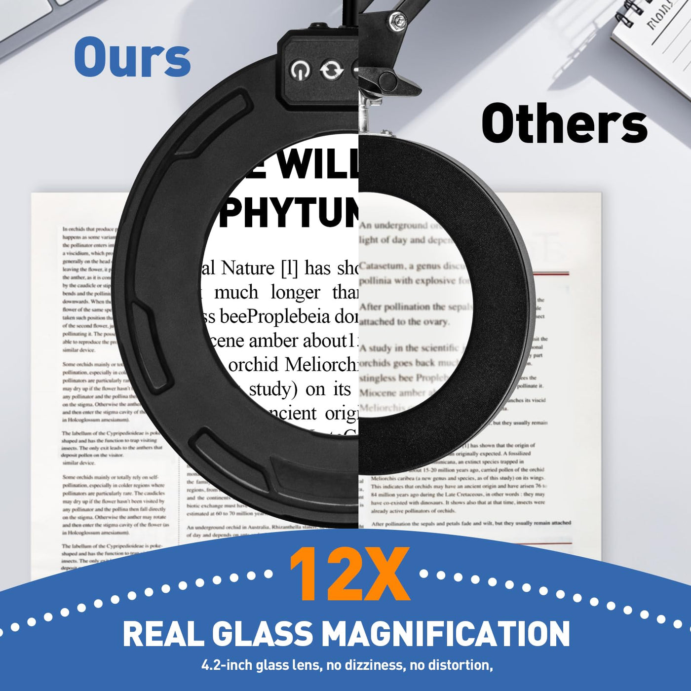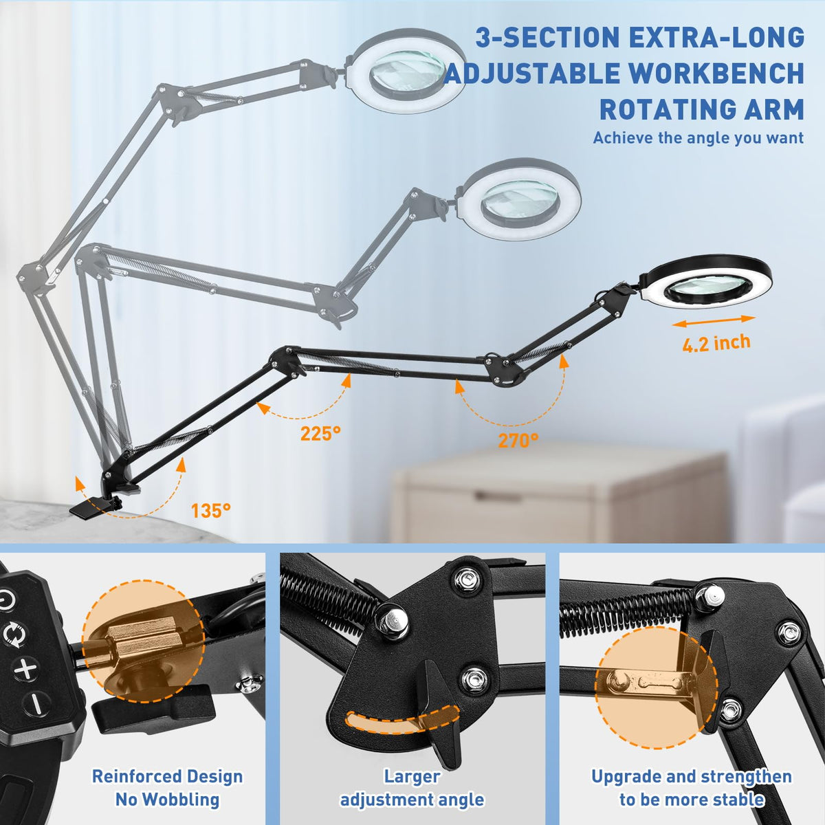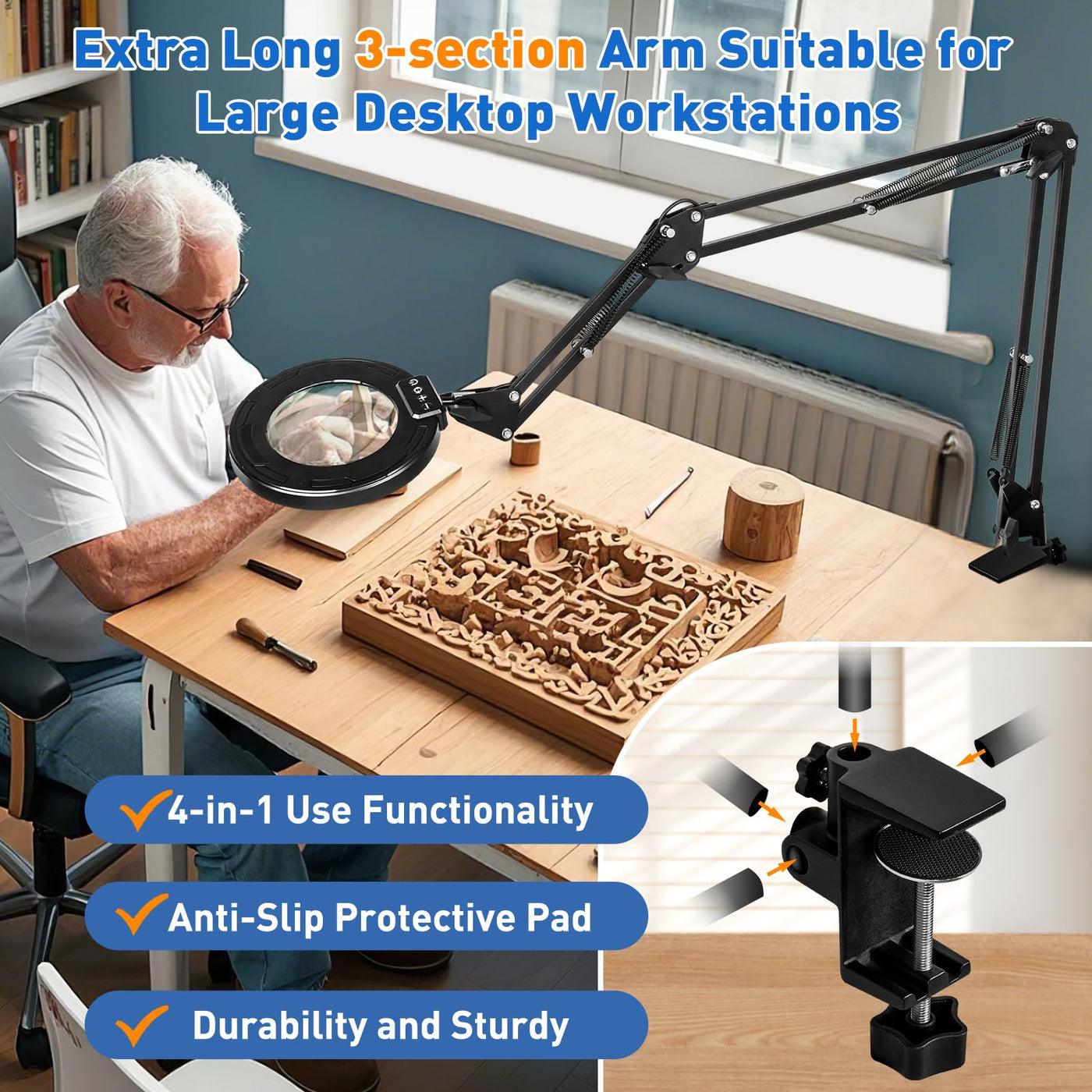 Hitti Ultra Long 12X Magnifying Glass With Light And Clamp, 5 Color Modes Steepless Dimming Desk Lamp, Swivel Arm Workbench Ligh