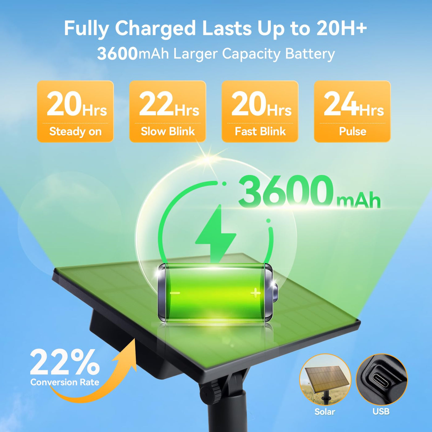 Solar & USB Charging: Equipped with a powerful 3600mAh battery for 10-20 hours of runtime per full charge.