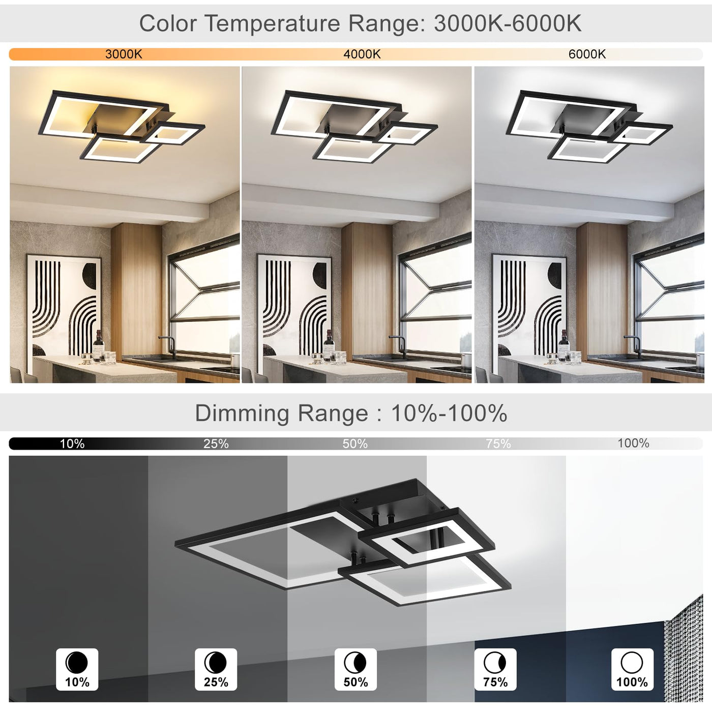 Q: What are the main features of the HLILCEH Modern Black Led Ceiling Light?A: The HLILCEH Modern Black Led Ceiling Light features a unique 3-square design, is dimmable with a remote control, and offers adjustable color temperatures ranging from 3000K to 6500K. It is made from a combination of thickened aluminum and acrylic, ensuring durability, heat dissipation, and soft light. The light has a high CRI index of up to 95, making it ideal for vibrant color representation.