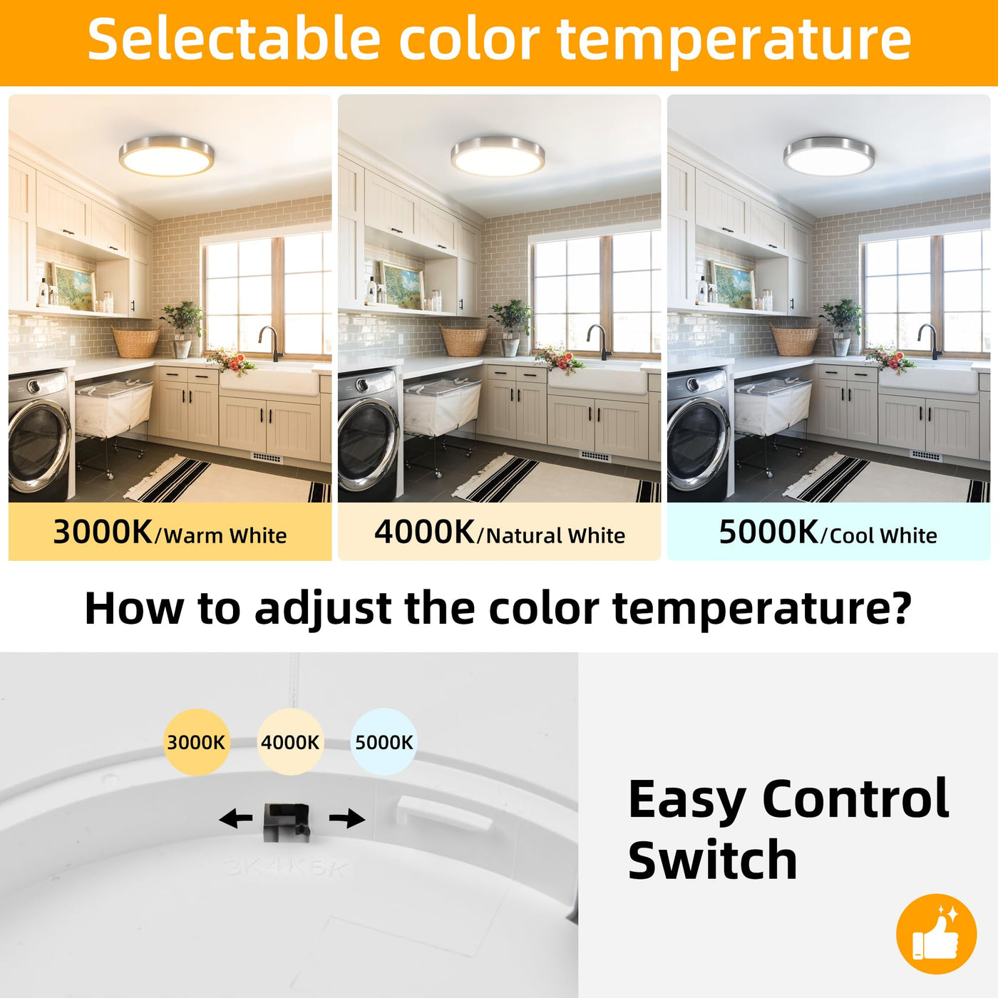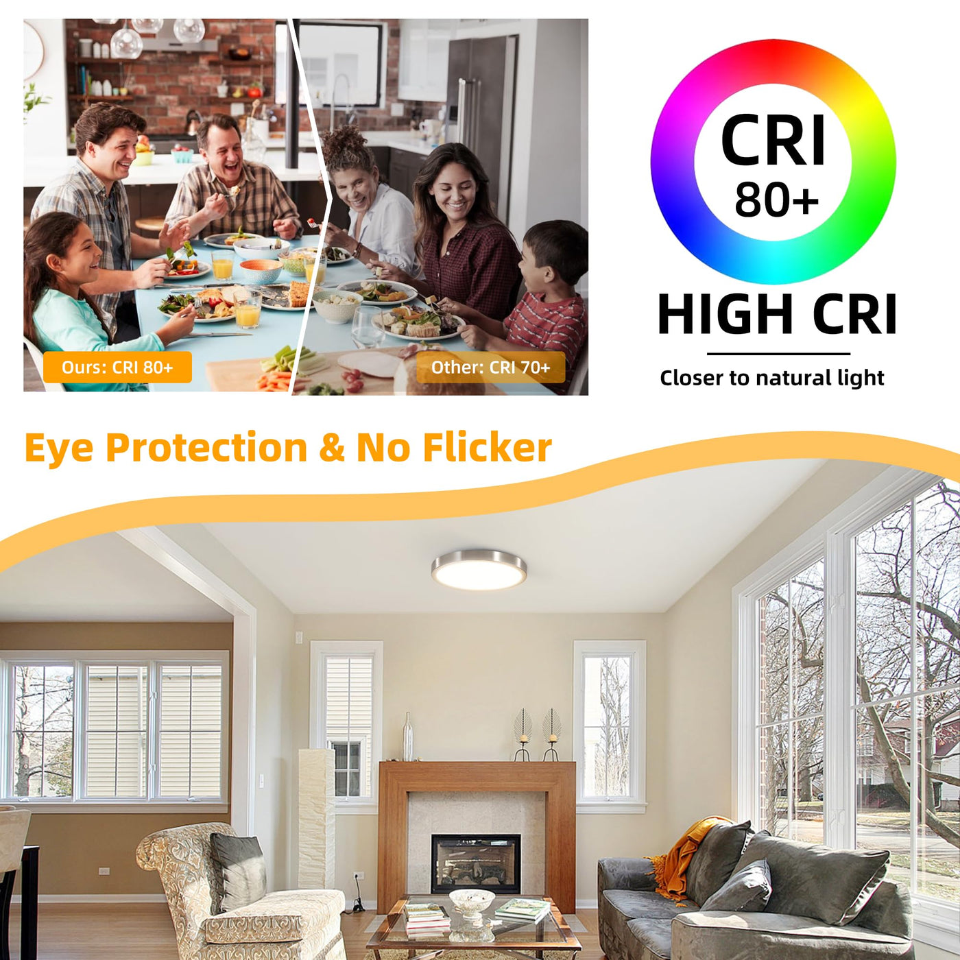 This ceiling fixture features three selectable color temperatures: 3000K Comfort Warm White, 4000K Neutral White, and 5000K Cool Bright. This allows you to tailor the ambiance according to your needs and preferences. The light is engineered for eye protection, providing flicker-free, blue light-free, radiation-free, and UV-free illumination. It ensures a safe and comfortable environment, making it perfect for tasks such as reading and studying.