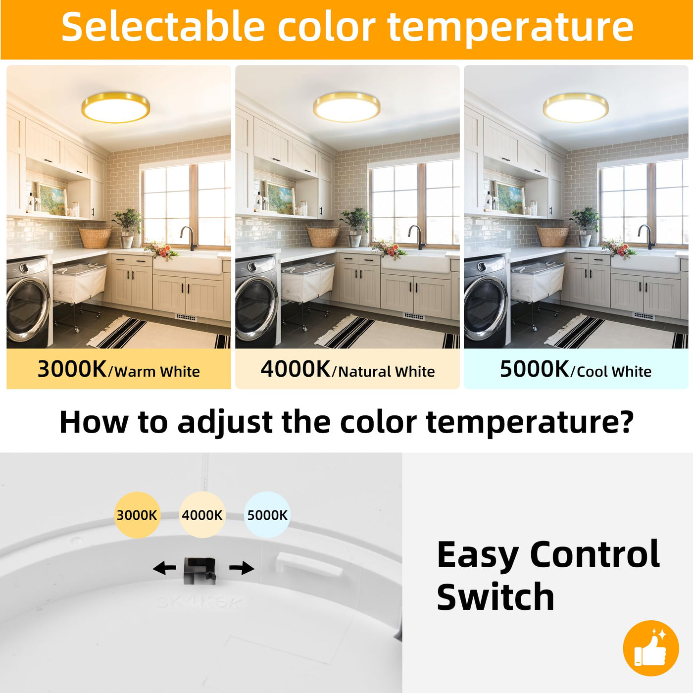 Q: What are the available color temperatures for the Hlite flush mount ceiling light?A: The Hlite flush mount ceiling light offers three color temperatures: 3000K for a warm white light, 4000K for a neutral white light, and 5000K for a cool bright light, allowing you to choose according to your preference and needs.