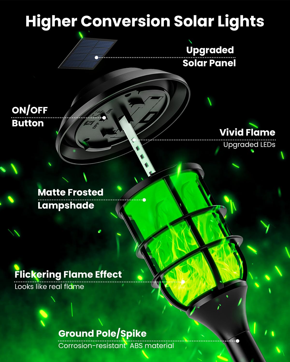 Q: Can I use these lights for decorative purposes in my garden?A: Absolutely! The flickering flame effect of these solar torch lights makes them an excellent decorative addition for your garden, patio, or pathway, enhancing the ambiance.