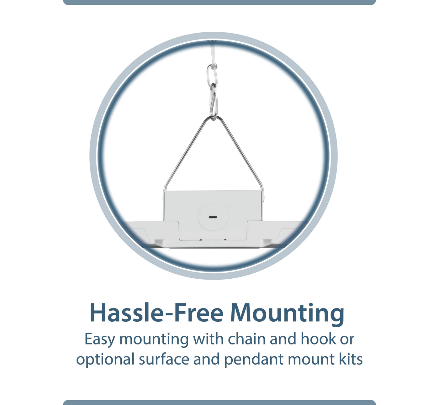 Q: What installation options are available for the HML1 LED High Bay?A: The HML1 comes with a V-Hook and Chain mounting system, allowing for easy installation in various settings. It can be mounted directly to ceilings or suspended to achieve the desired height for optimal lighting.