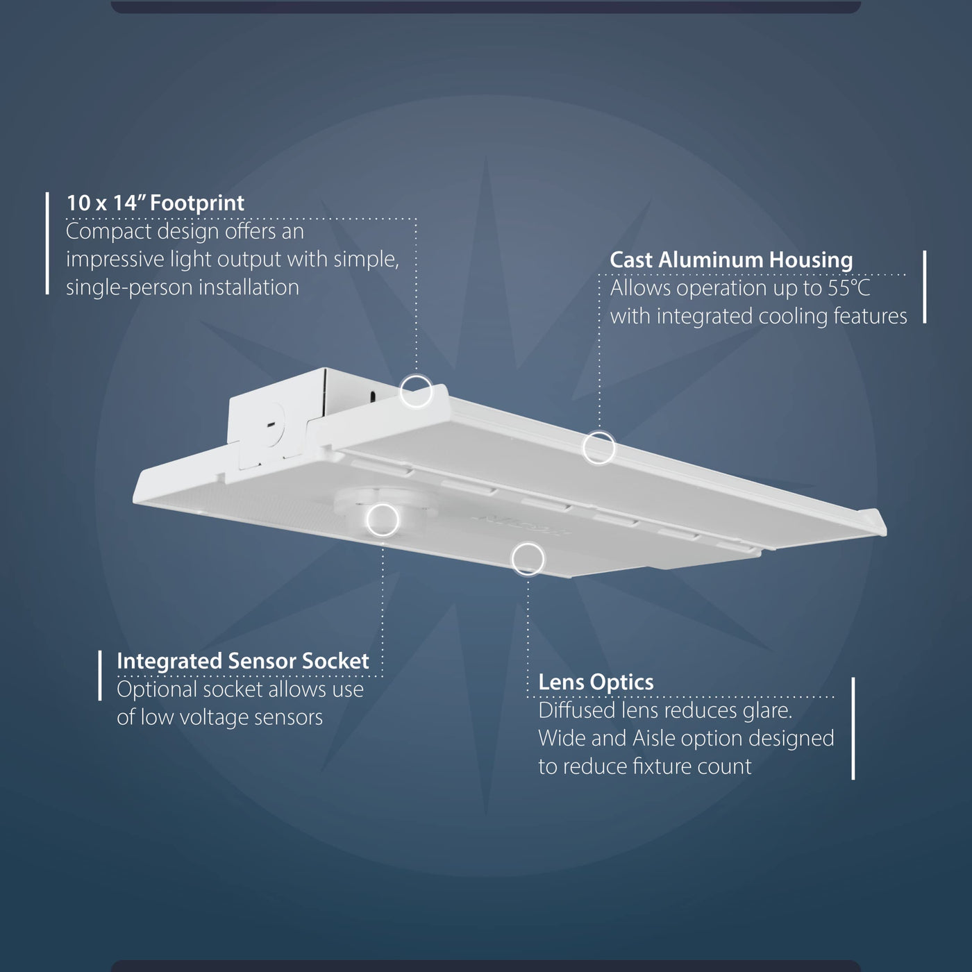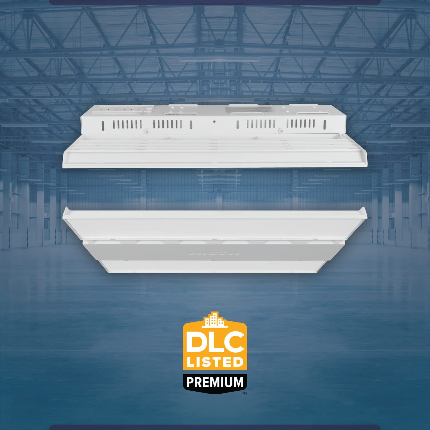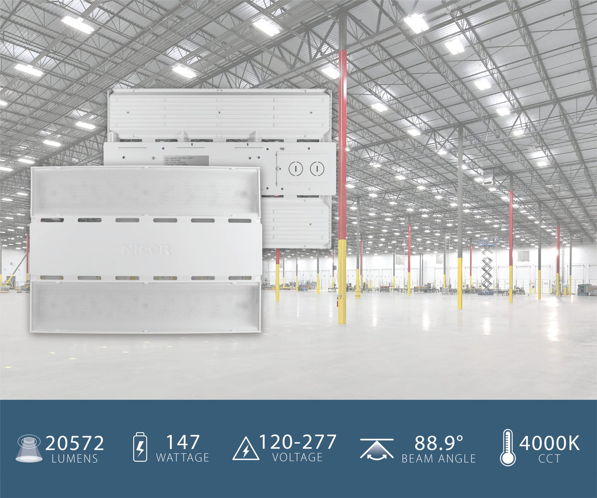 The HML1 is the newest addition to NICOR’s high bay product family. With it’s slim 10x14” footprint (on smaller wattages), the HML1 offers the high performance of a full-size fixture in a compact package. Available in 4000K & 5000K color temperatures with a variety of wattage and aisle distribution options, making it the ideal solution to replace traditional fluorescent fixtures. The DLC 5.1 Premium fixture is equipped with built in 0-10V Dimming (full-range) and is Damp-Location Rated. Included is a V-Hook and Chain mounting system for easy installation. With its durable single-piece cast aluminum design, the HML1 is perfect for rugged applications like warehouses, gymnasiums, and other industrial or commercial spaces.