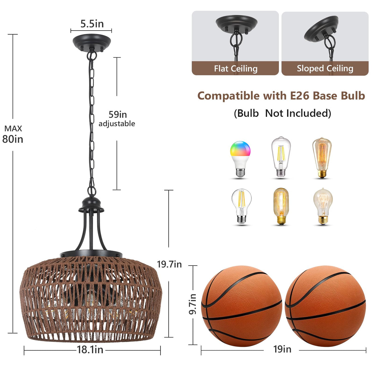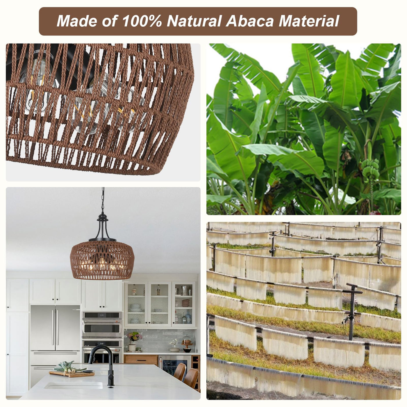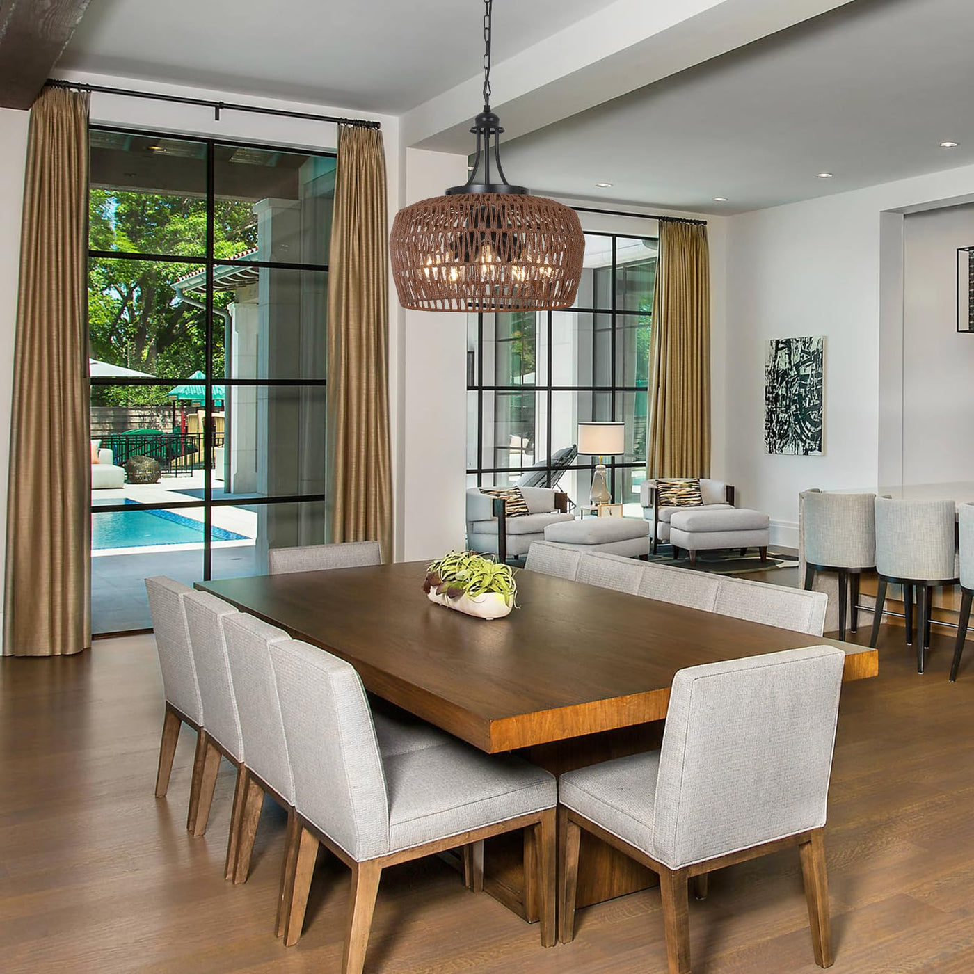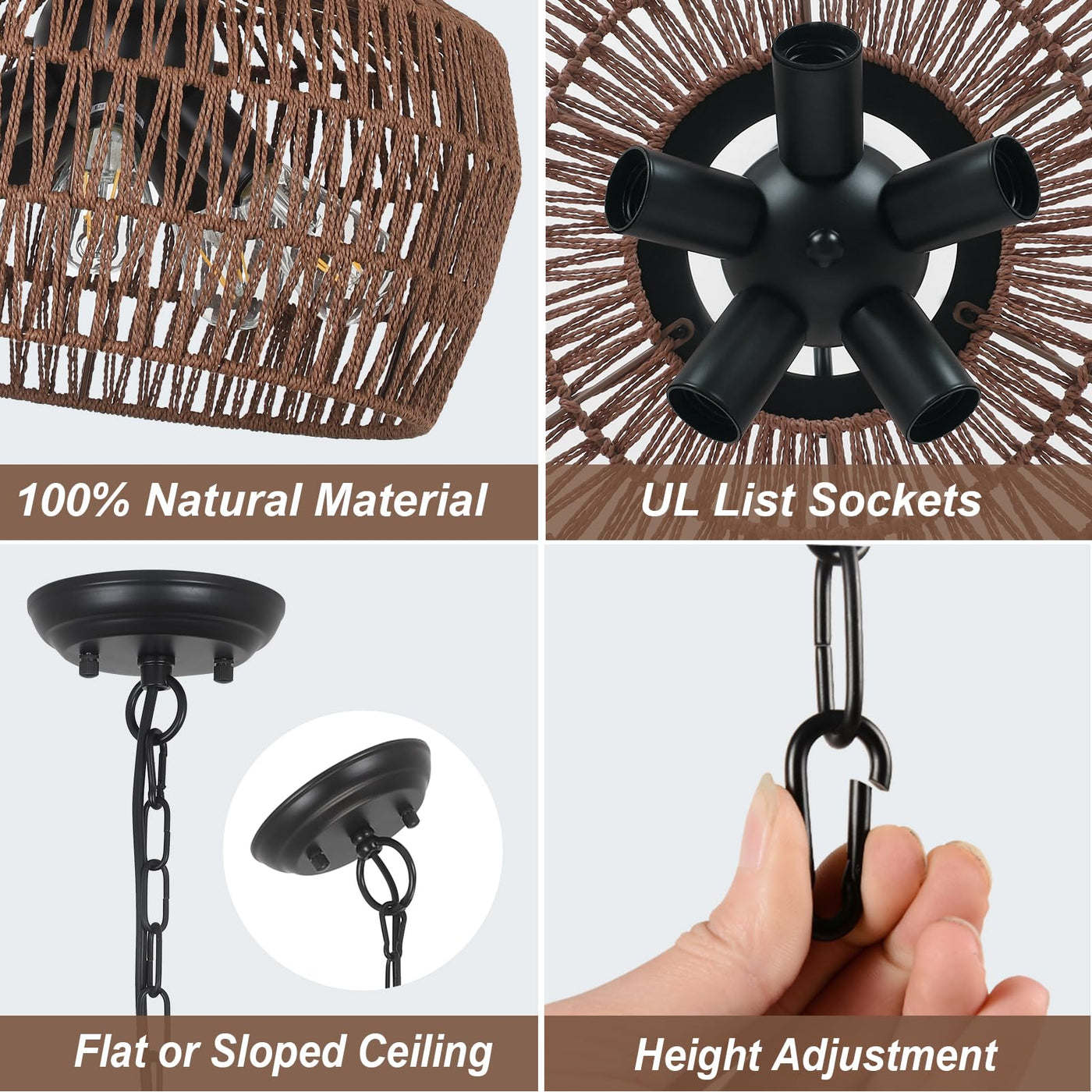 Hmvpl Coffee Rattan Chandeliers For Dining Room, 5-Light Coastal Chandelier With Wicker Lampshade, Large Farmhouse Light Fixture