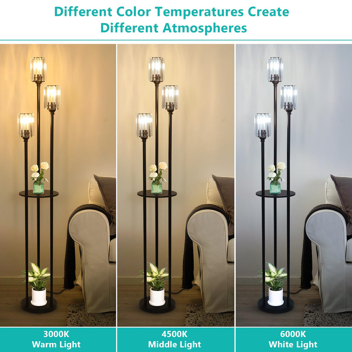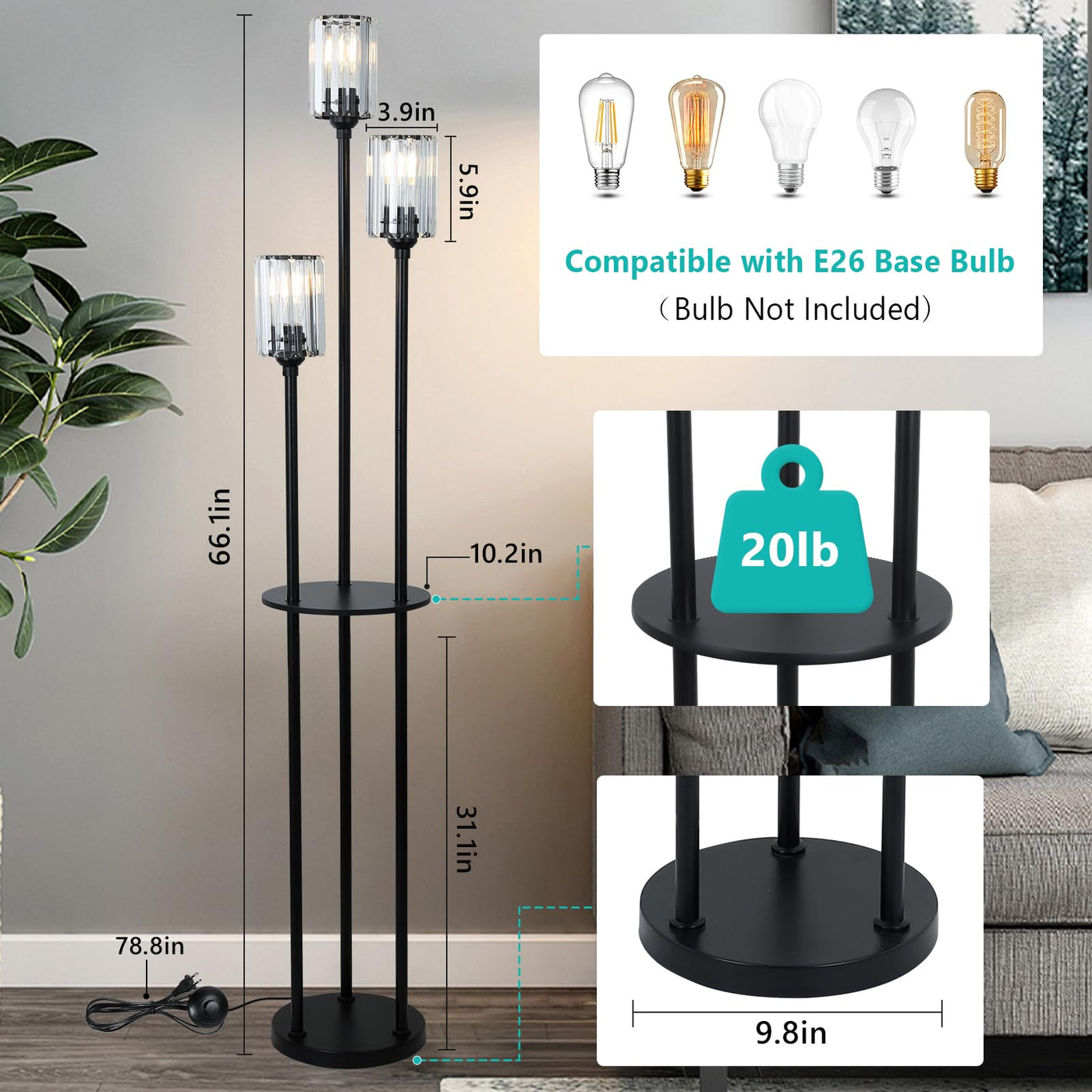 Hmvpl Crystal Floor Lamp With Shelves - Modern Standing Lamp For Living Room & Bedroom, Black With Crystal Shade, 3-Light, On/Of