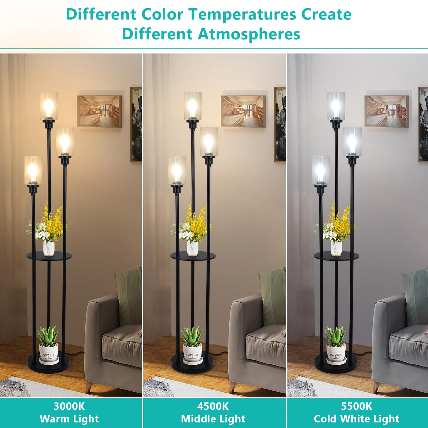 Hmvpl Floor Lamps For Living Room, 3-Lights Modern Floor Lamp With Shelves, Farmhouse Standing Lamp With Glass Shades, On/Off Fo