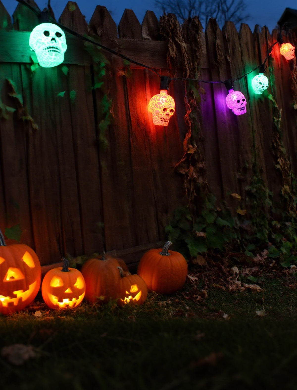 Q: What colors do the lights display?A: The lights feature a multicolor design, providing a vibrant and spooky atmosphere perfect for Halloween decorations.