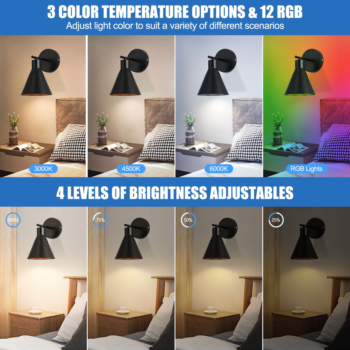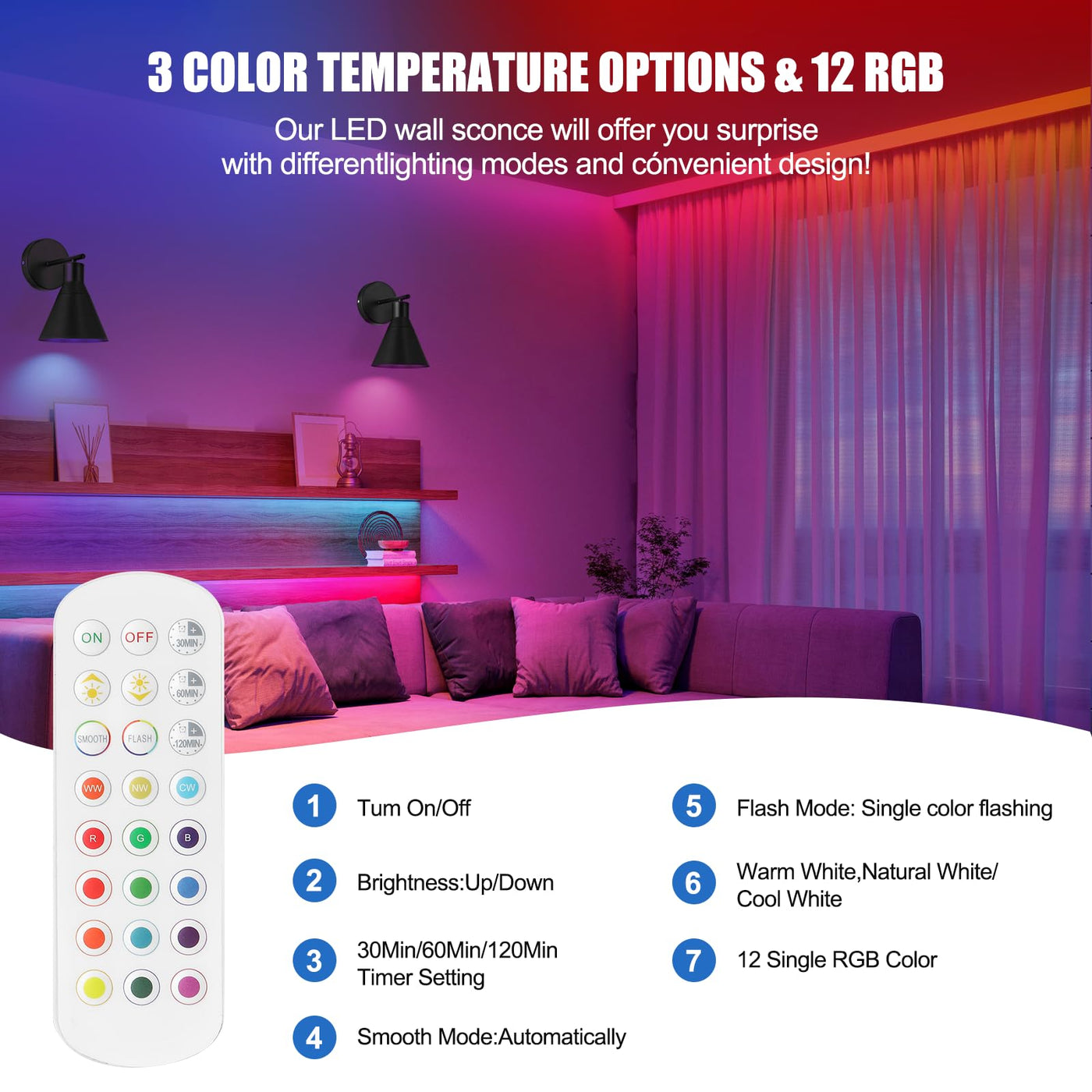 Q: What are the lighting options available for the HOJOYRI wall sconces?A: The HOJOYRI Modern Wireless Battery Operated Wall Sconces offer versatile lighting options, including three color temperatures (3000K, 4500K, 6000K) and 12 RGB colors. You can choose to smoothly transition between colors or set a specific mood using the Smooth Mode, and adjust brightness with 10 dimmable levels from 10% to 100%.