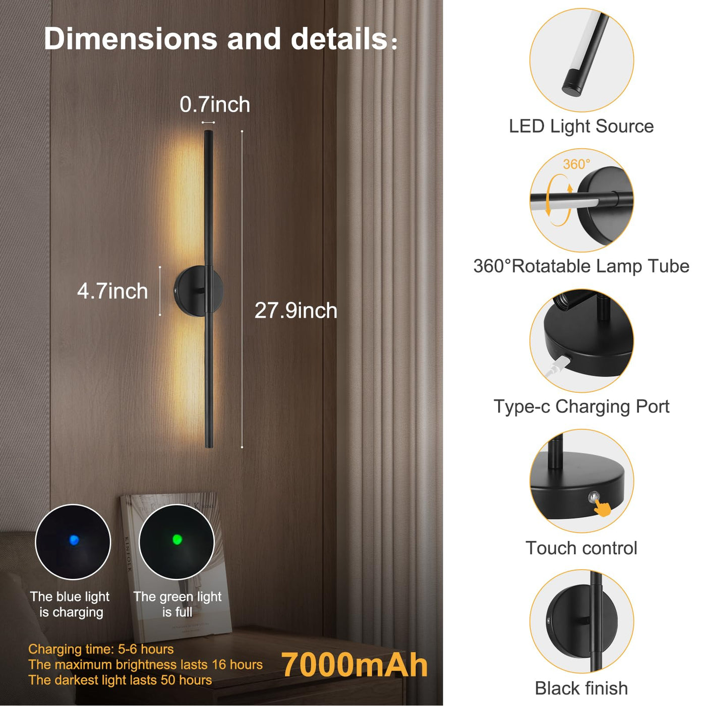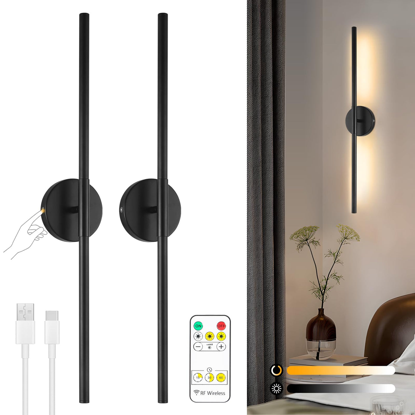 HOJOYRI Wireless Battery Operated Wall Sconces with Remote, Black Rechargeable Led Wall Lights Set of Two, Cordless Dimmable Battery Powered Wall Lamp Decor For Bedroom Living Room, 3 Color, 28 Inch