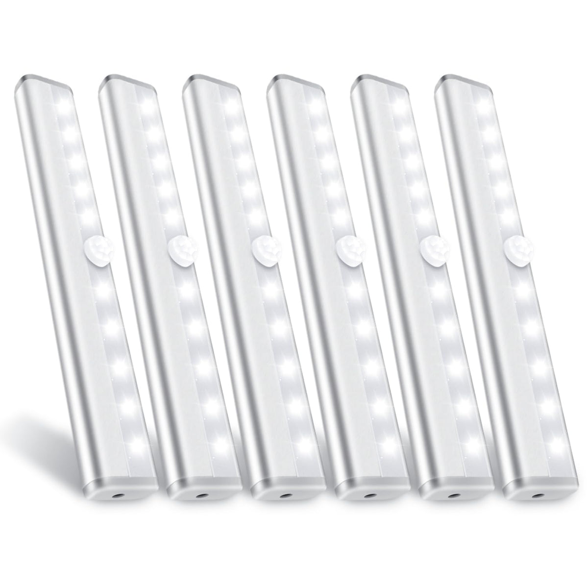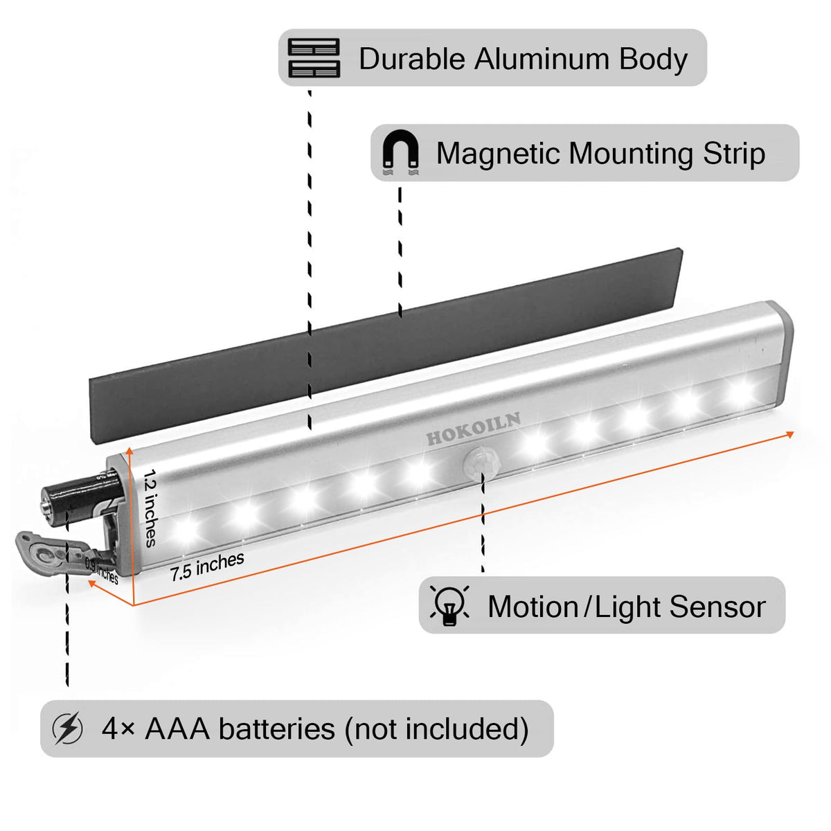 HOKOILN Motion Sensor Closet Lights, 10 LED Battery Operated Night Light Bar, 6 Pack, Aluminum, White, Model 5833