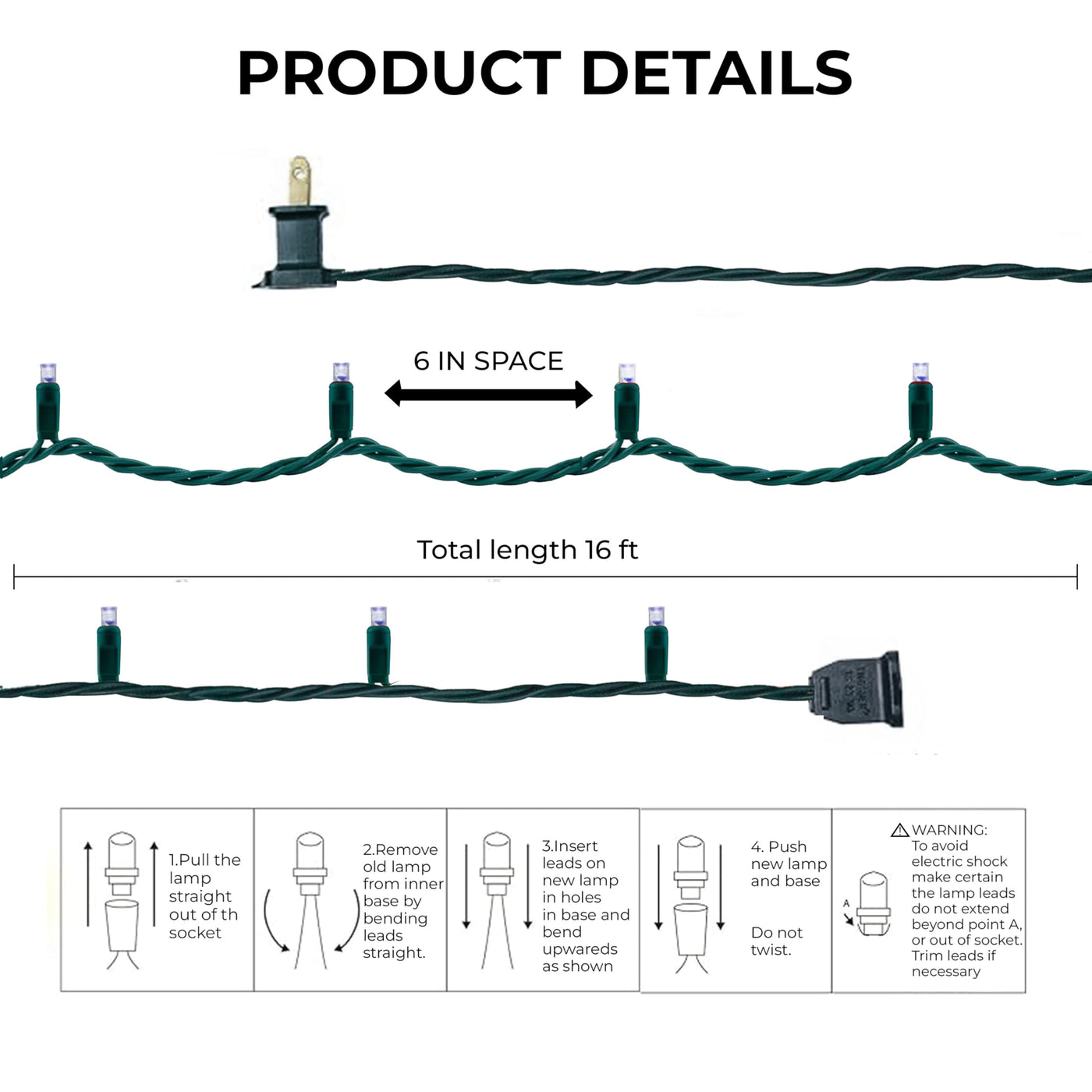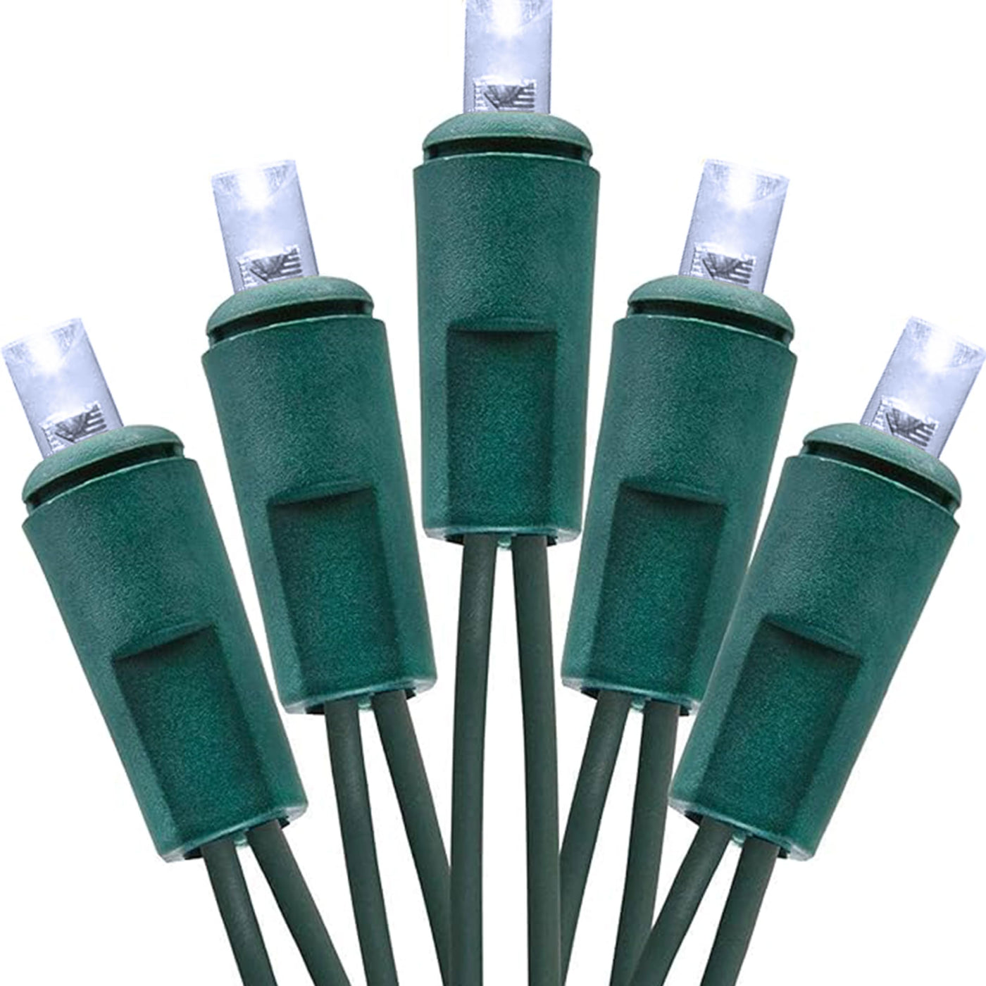 Lighting Specs: Set includes 60 cool white LED bulbs on green wire that create a bright, festive glow perfect for Christmas decorating.