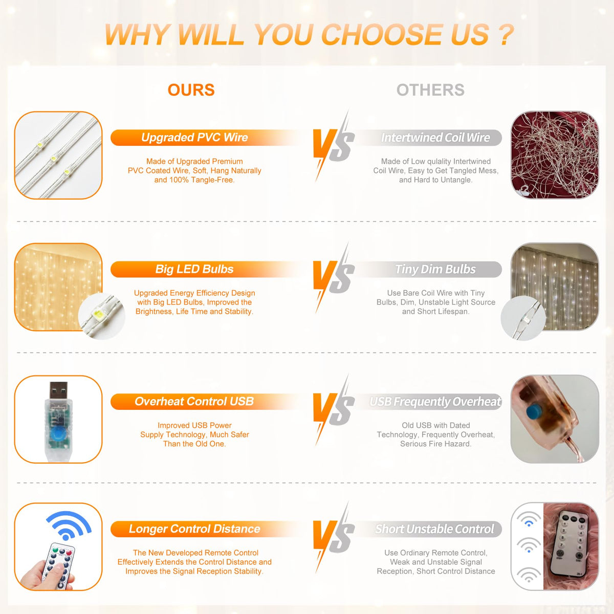 Holits Fairy Curtain Lights Upgraded 100% Tangle-Free Warm White Usb Plug In 8 Modes String Hanging Lights With Remote For Christmas, Bedroom, Indoor, Outdoor, Weddings, Party (10Ftx8.2Ft)