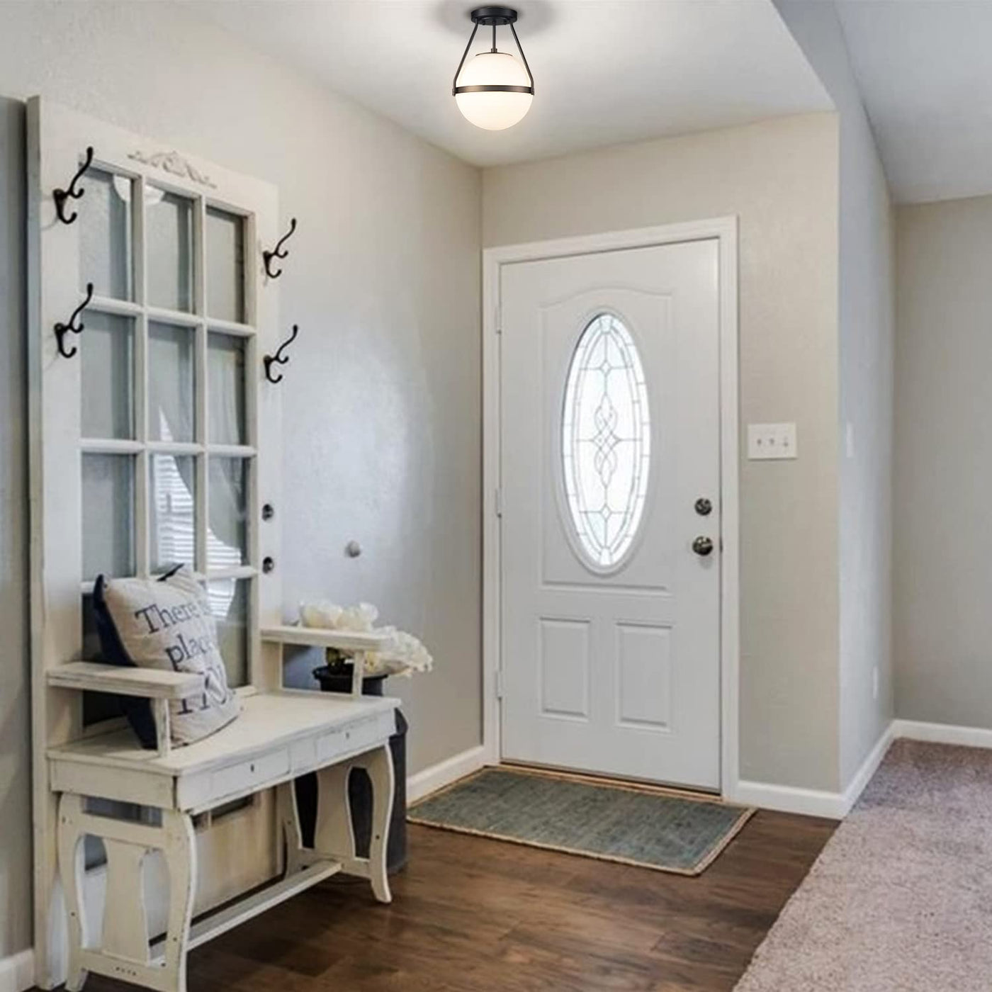 This ceiling light features a sleek black metal body paired with a milk white globe glass shade. The opal glass allows for soft, diffused lighting, creating a comfortable atmosphere in any room. With its contemporary design that blends modern and vintage styles, this fixture serves as a decorative element while providing practical lighting.