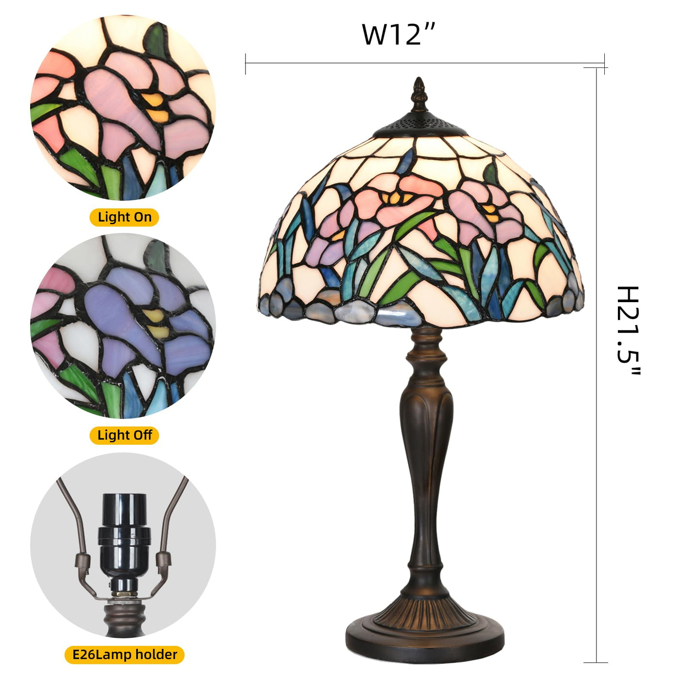 Q: What are the dimensions of the HomeBeauty TL0004 Tiffany Table Lamp?A: The HomeBeauty TL0004 Tiffany Table Lamp measures approximately 12 inches in diameter and 21.5 inches in height, making it a medium-sized lamp suitable for various settings.