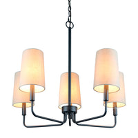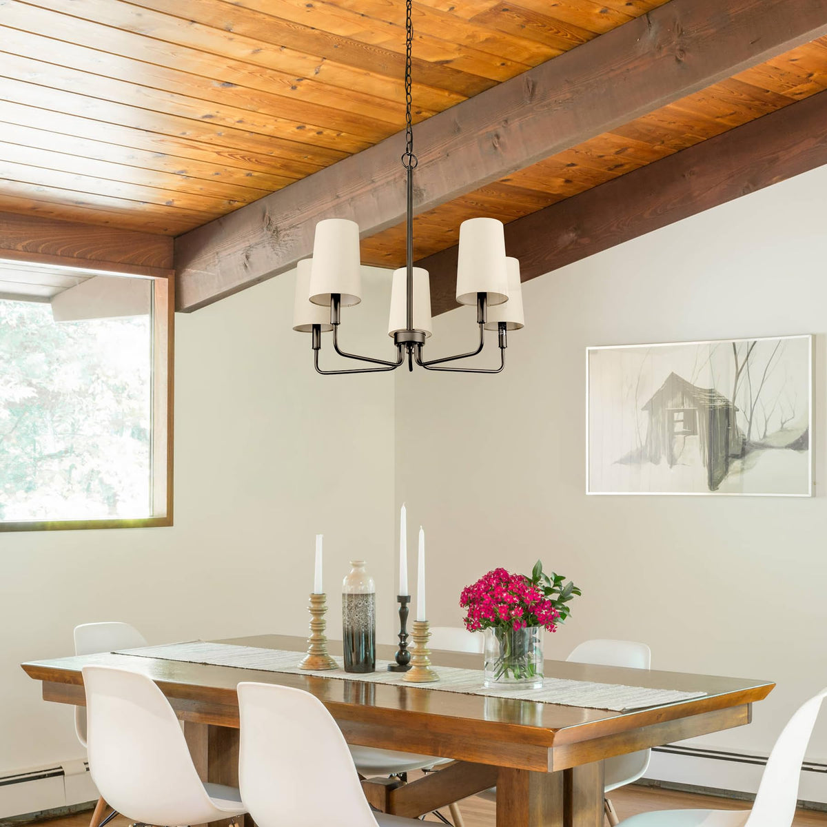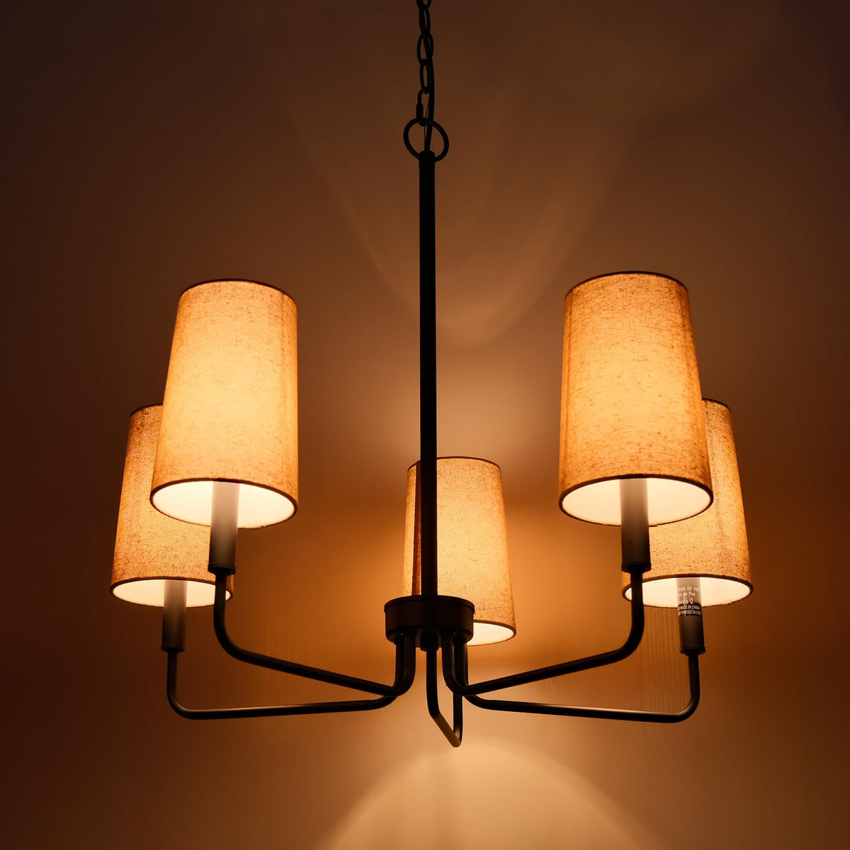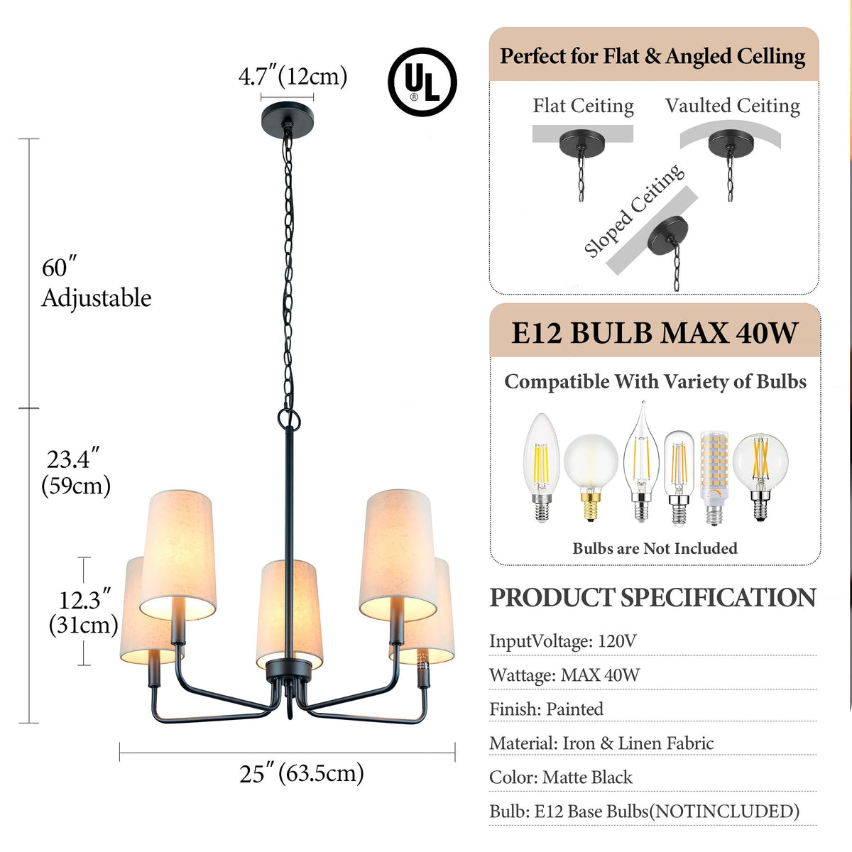 ??Impressive Chandelier for Home??This 5 lights chandelier features thin bar arms with white fabric shades in a classical and fashion style, suitable for Kitchen, Dining room, Stairwell and Entryway, also compatible with sloping or parallel ceilingsThe original intention of the design is to create a relaxed, comfortable and harmonious atmosphere, absolutely we believe it will enhance your home happiness??Product Information??Color: Matte BlackLength: 25.1 InchWidth: 25.1 InchHeight: 23.4 InchBulb: 5 max 40-watts E12 base bulbs (Bulbs Not Included)??Quality of craftsmanship?? Homebelife will refuse low quality all the time, bringing customer a wonderful product is our motivation to move on,so If there is any quality problem with your pendant light within 90 days, please do not hesitate to tell us, we will ensure your satisfaction