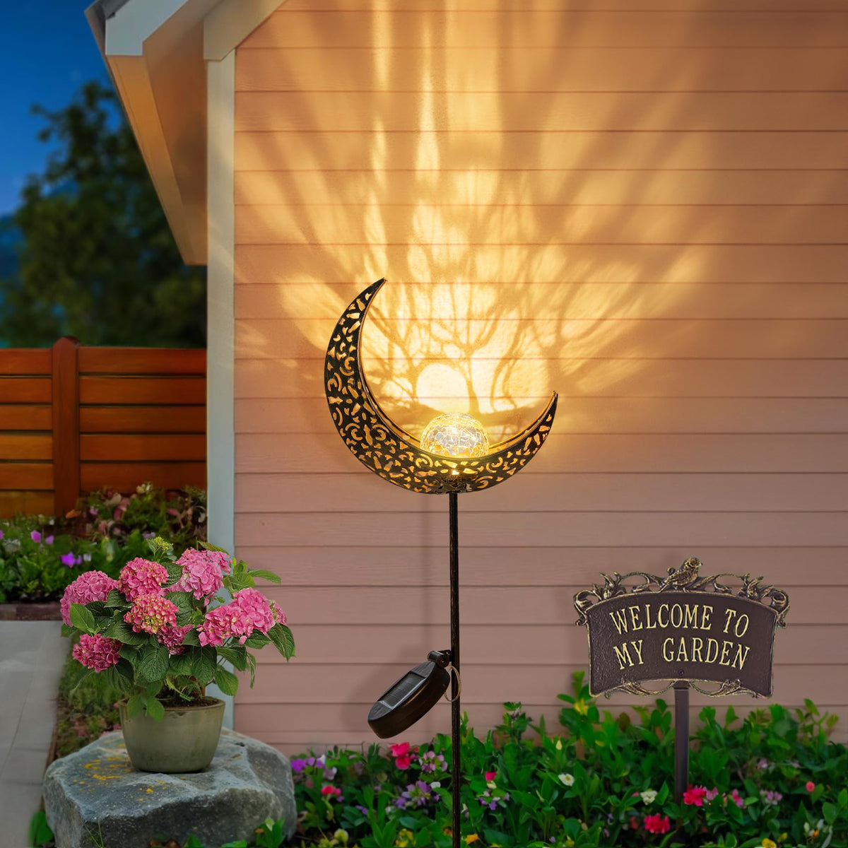 The crescent moon outdoor garden lights design with Warm White 8 Lumens LED, emit stunning glow.The reflection of the pattern is beautiful enough to create a romantic and festive atmosphere in your front porch, back yard, lawn or garden.