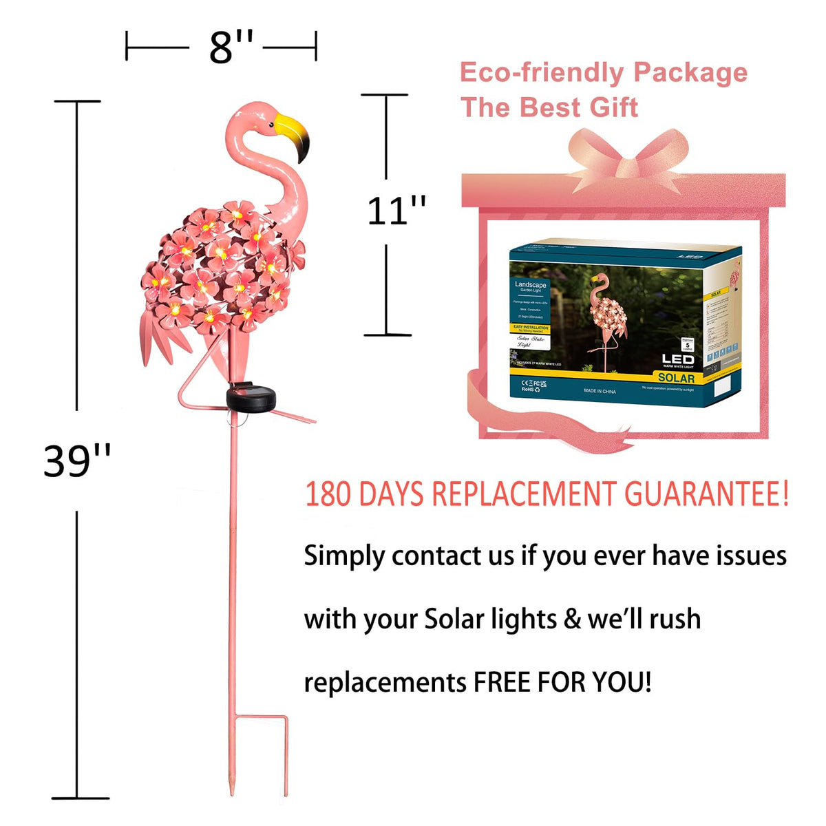 Q: What are the dimensions of the flamingo solar lights?A: The Homeimpro Garden Decor Solar Lights measure approximately 39 inches in height, 8 inches in width, and 3 inches in depth, making them a perfect decorative addition to your garden, yard, or patio.