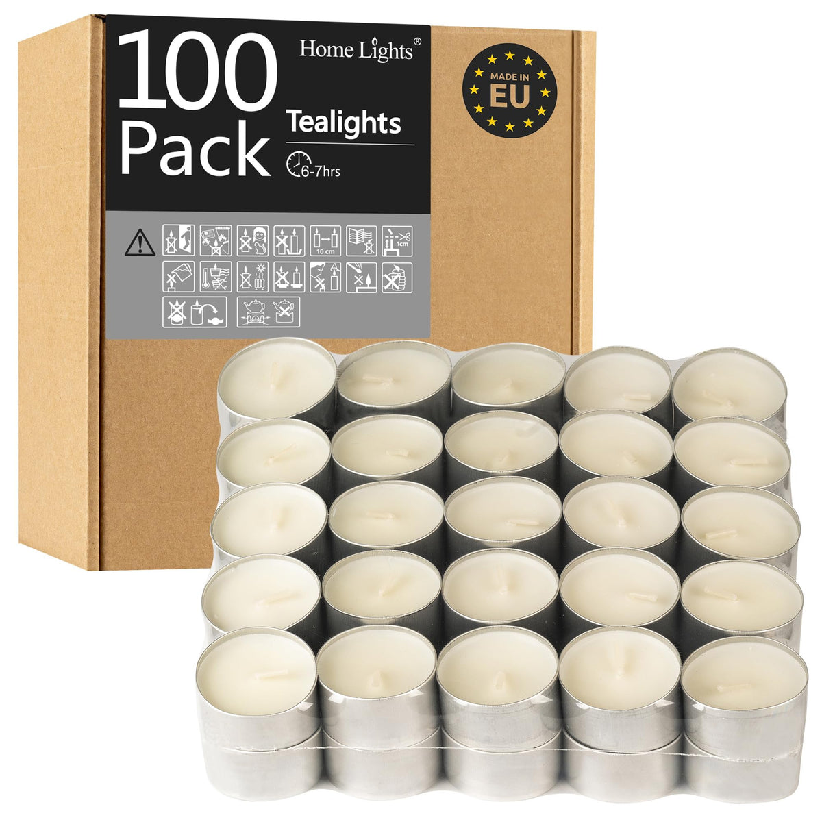 Q: How long do HomeLights tealight candles burn?A: HomeLights unscented tealight candles have a long burn time of 6 to 7 hours, allowing you to enjoy their warm glow without frequent replacements.