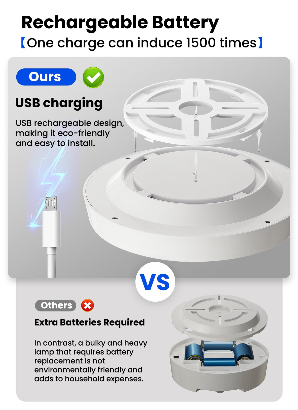 Q: How long does the rechargeable battery last in the Homelist ceiling light?A: The Homelist rechargeable ceiling light features a large-capacity battery that can last up to 40,000-50,000 hours. When fully charged, it can operate in auto-sensor mode for up to 3 months, assuming it's activated approximately 10 times per day.