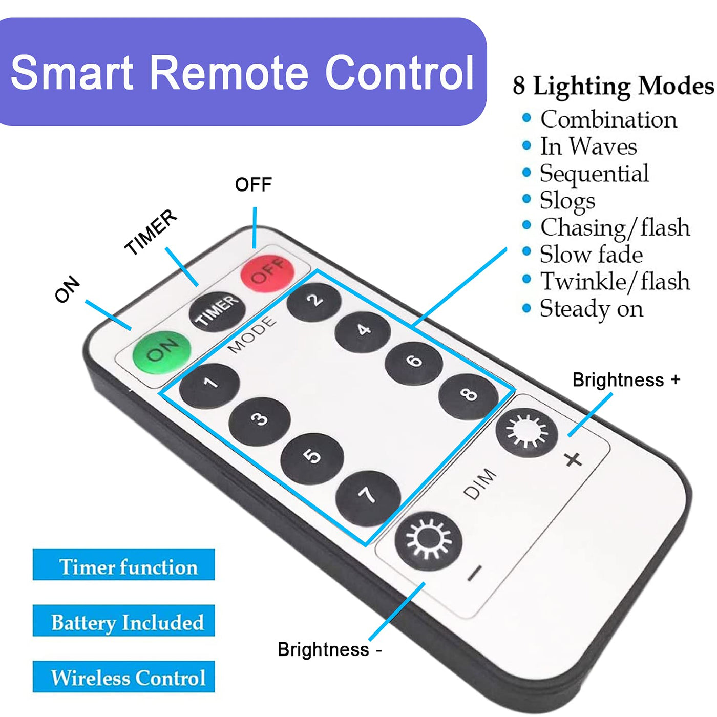 Remote Control & Timer: Easily Adjust Brightness And Switch Between 8 Lighting Modes, Including Twinkle And Steady On. The Built-In Timer Keeps Lights On For 6 Hours And Off For 18 Hours Automatically.