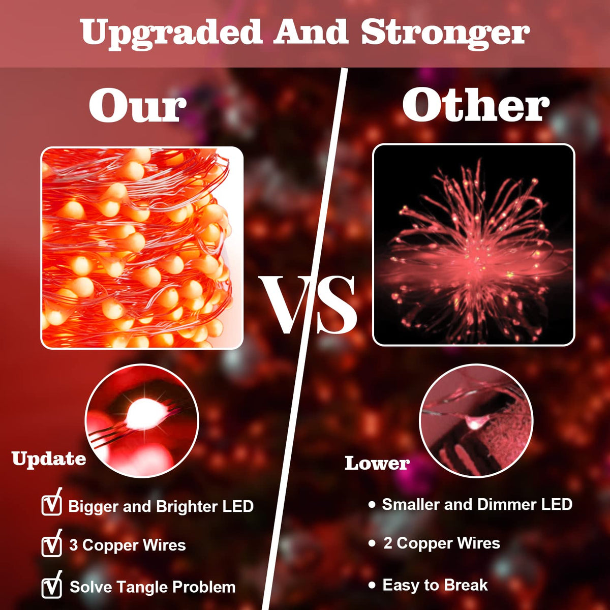 Crafted From well-made Copper, These Fairy Lights Utilize Advanced Fogged Technology, Resulting In Beads That Are Five Times Larger Than Standard Micro Lights. This Ensures Higher Color Reproduction And A Brightness Level That Is More Than Twice That Of Typical Red Twinkle Lights. Despite Their Intensity, The Lights Maintain A Soft Glow, Making Them Suitable For Use In Dark Settings Without Being Dazzling. Each String Measures A Total Of 66 Feet, Providing Ample Length For Versatile Decorating Options.