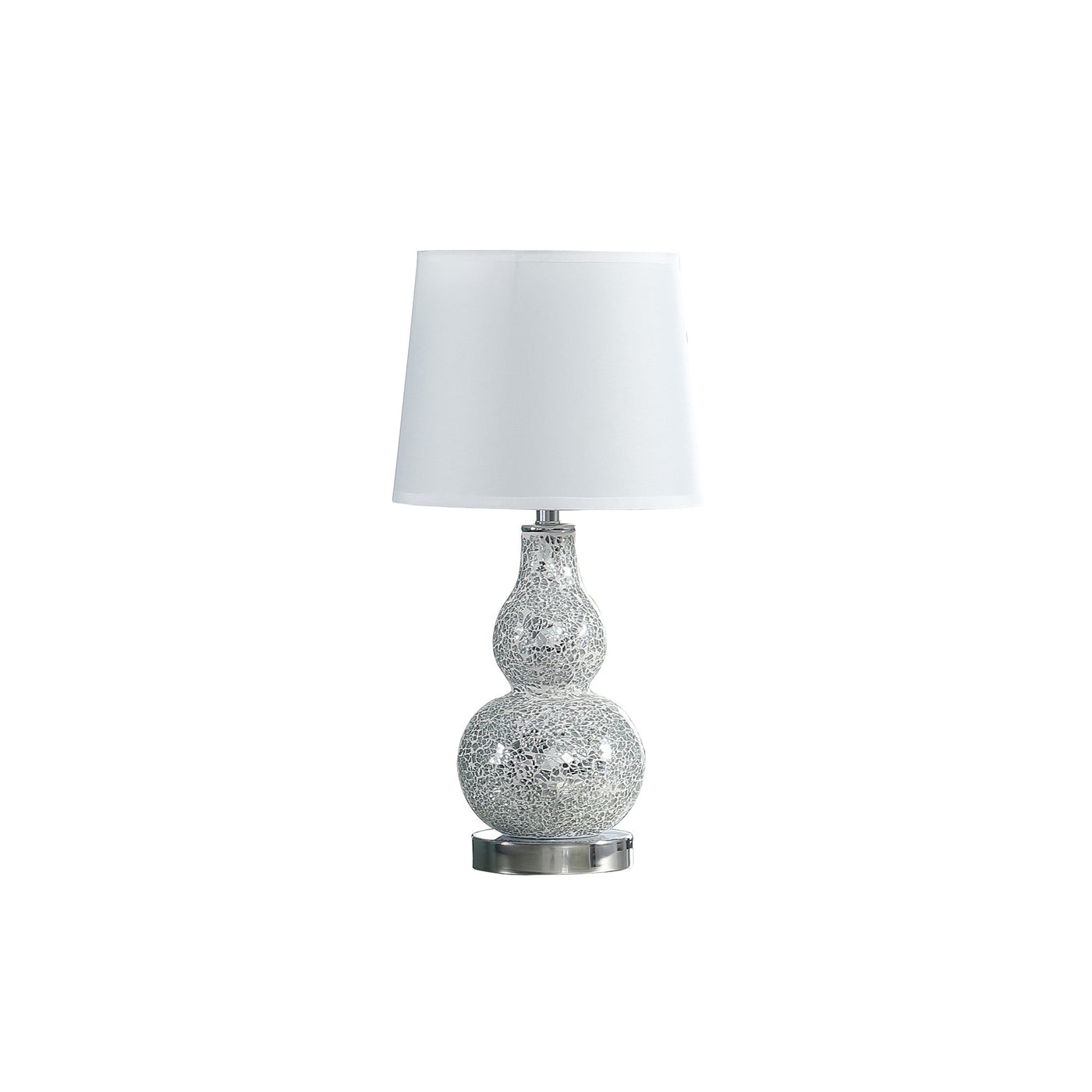 This beautiful table lamp measures 19.5" in height, with a shade size of 9.75" L x 8.25" W x 8" H, making it the perfect size for any table or desk. The silver color and white finish provide a neutral palette that complements various interior styles. Whether you want to brighten up your living room, create a cozy atmosphere in your bedroom, or add a touch of elegance to your office, the Mirrored Crackle Glass Mosaic Curvy Table Lamp is the ideal choice.
