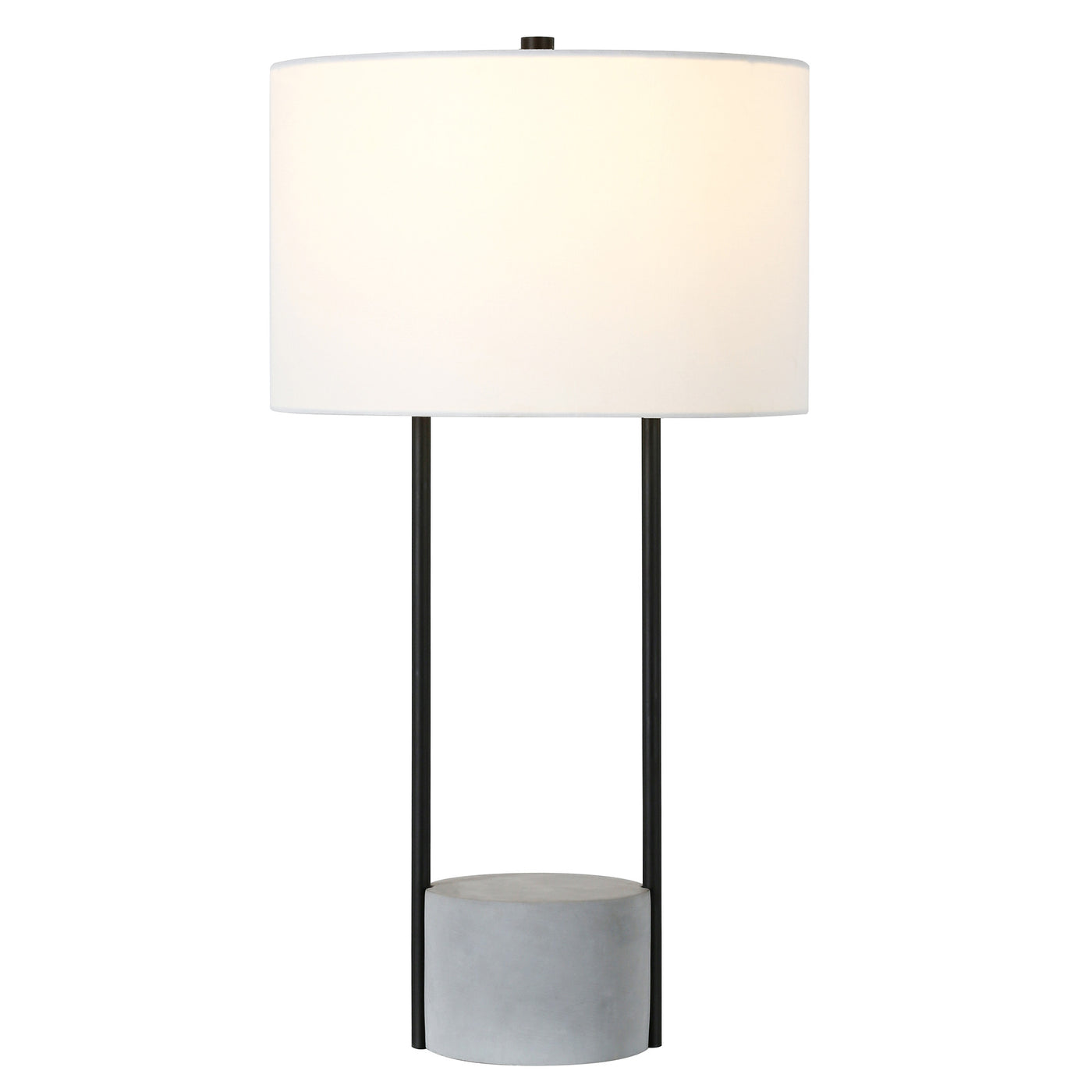 Q: What materials are used in the construction of this table lamp?A: This table lamp features a base made of concrete in a gray and black finish, complemented by a white fabric drum shade.