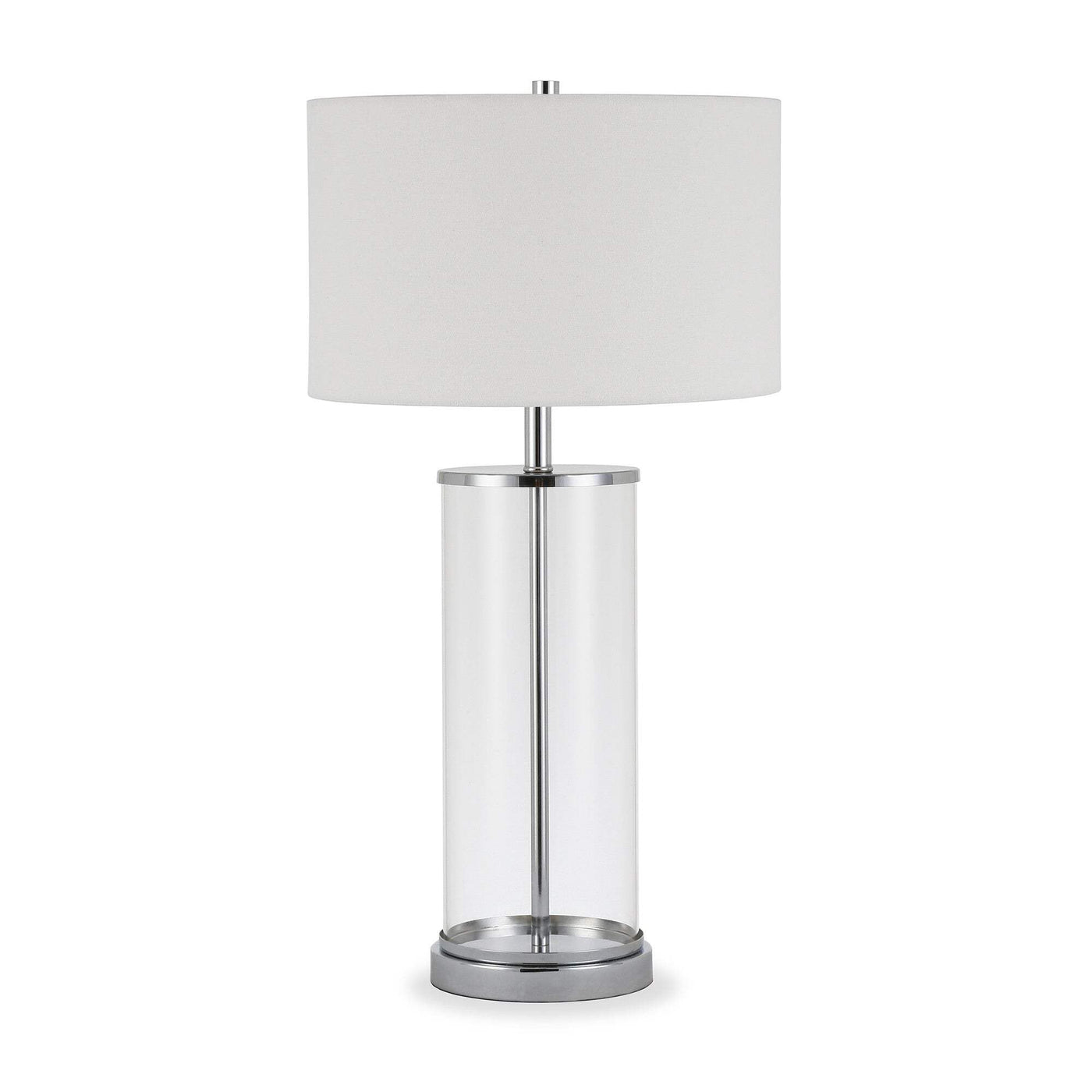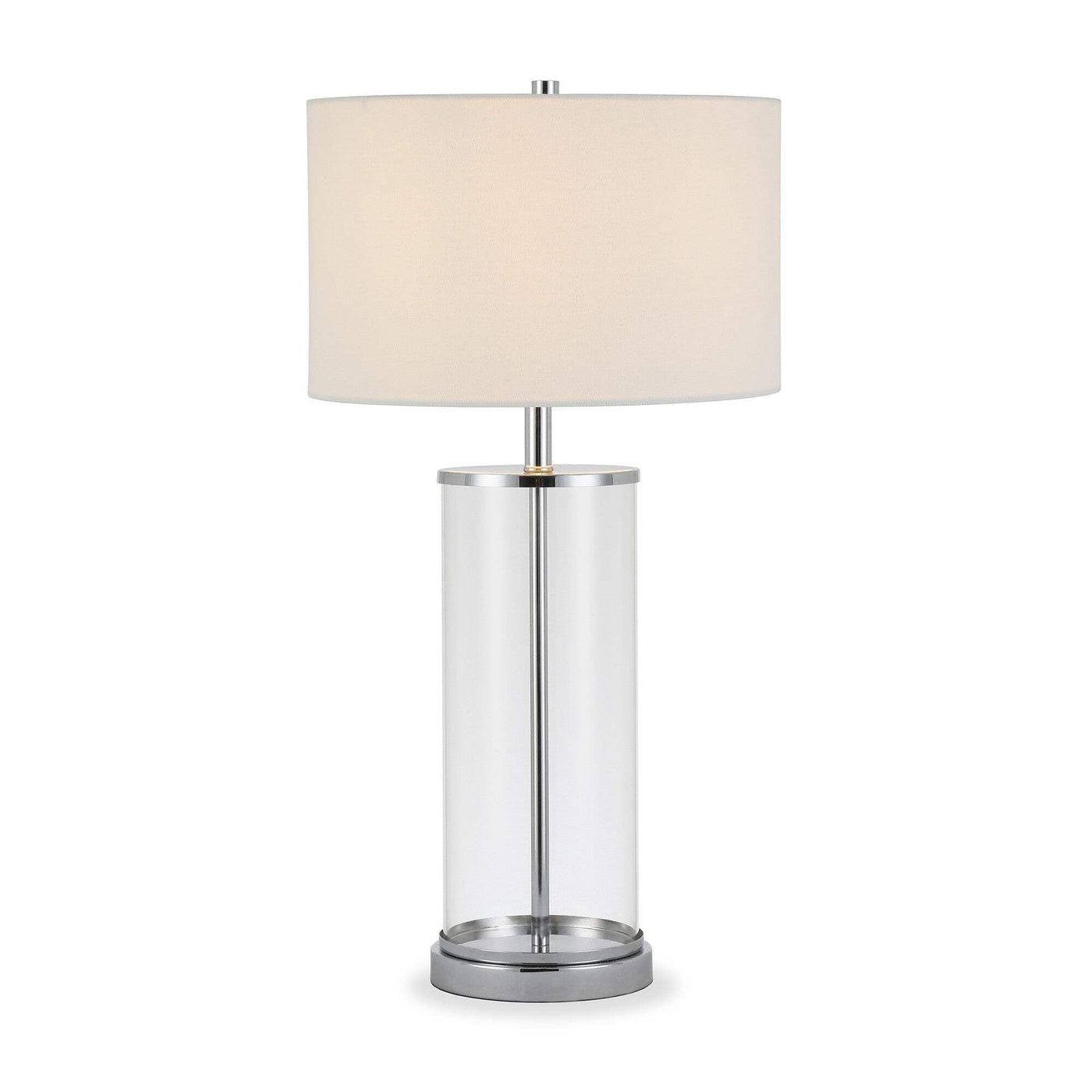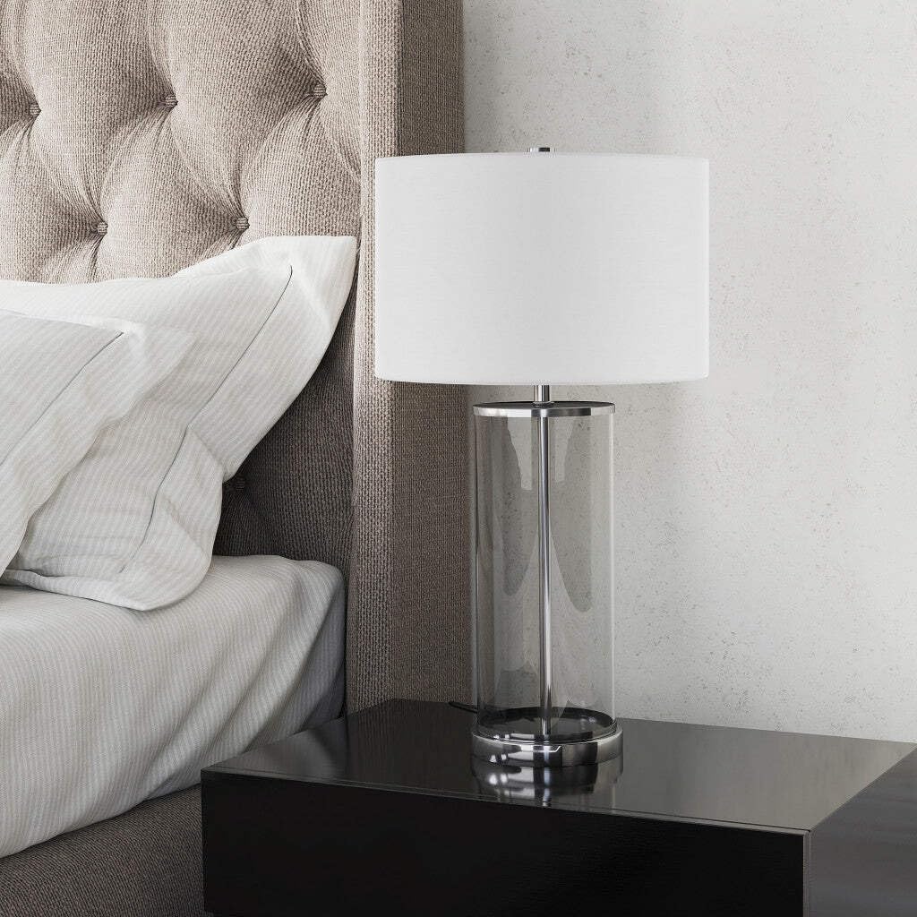 Q: What materials are used in the construction of this table lamp?A: This table lamp features a polished nickel base made of glass and comes with a white fabric drum shade, combining style and functionality.
