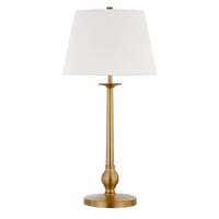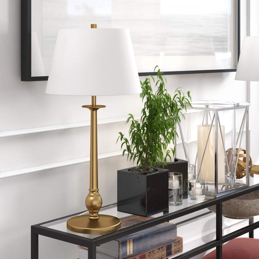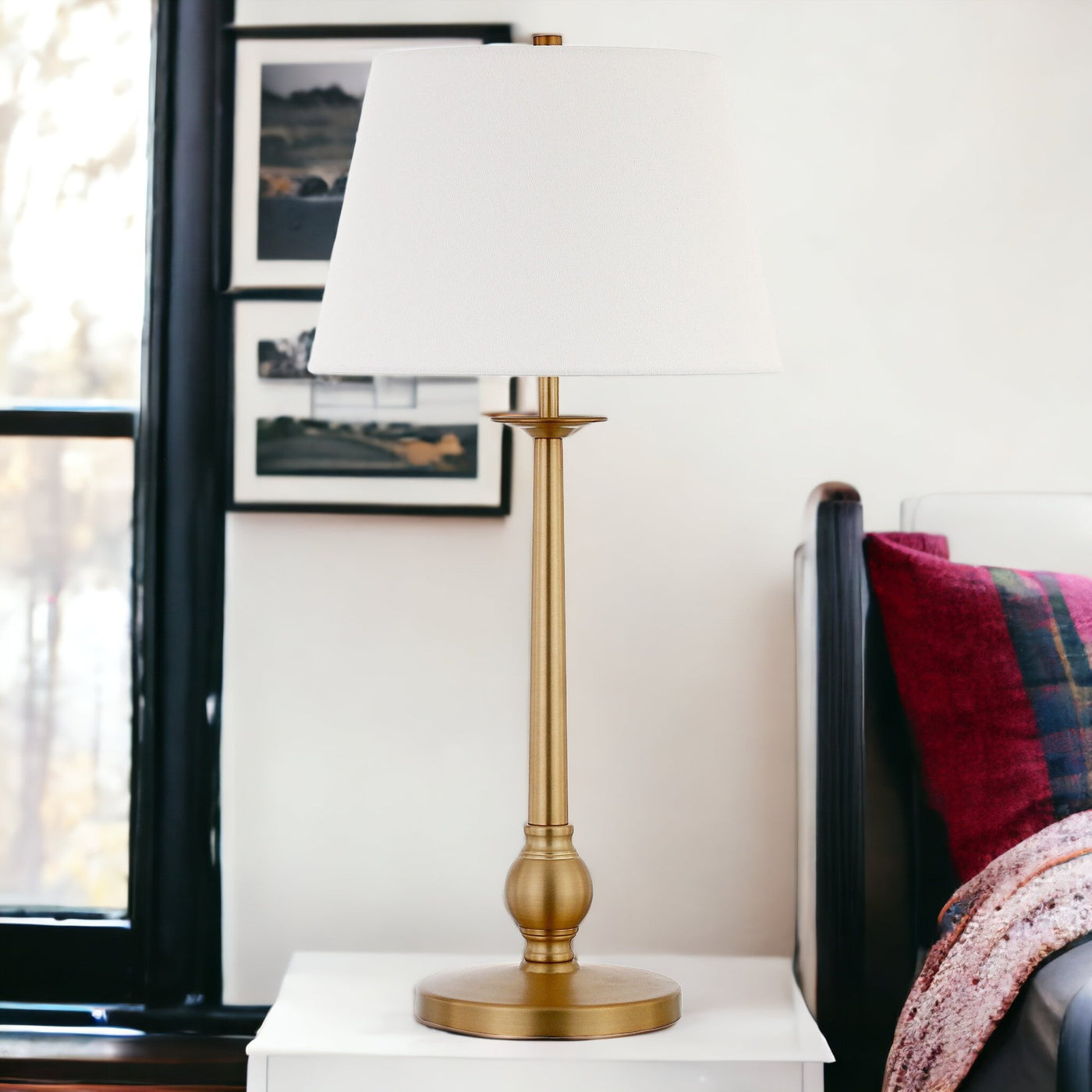 With this 28inch brass metal table lamp with white empire shade you can bring in design to any space along with adding some ambient lighting. The base of this lamp is made of metal finished in a brass tone. The white empire fabric shade is a great compliment to this lamp. This standard table lamp is designed to provide general lighting to the area. Use this lamp anywhere and elevate the look of the whole space. The perfect lamp to create just the right natural and soothing light in your space. Features. Lamp features a rotary socket switch for ease and convenience. Includes a 72 inch cord. Integrated LED bulb type for energyefficient lighting. Features a slip uno shade fitter to attach the shade to the lamp base. Stylish brass base with a white fabric shade for a modern look. Comes complete with a white fabric empire shadeSpecifications. Color Brass. Material Metal. Bulbs Required Yes. Bulb Maximum Wattage 60 watt. Voltage 120. Base Color Brass. Metal Type Steel. Fixture Material Metal. Switch Type Rotary Socket. Theme No Theme. Shade Color White. Shade Material Fabric. Fabric Type 100% Linen. Shade Fitter Type Slip UNO. Base Material Metal. Shade Shape Empire. Shade Pattern Solid Color. Style Modern. Dimension 28 H x 13 W x 13 D. Weight 6.17 lbs