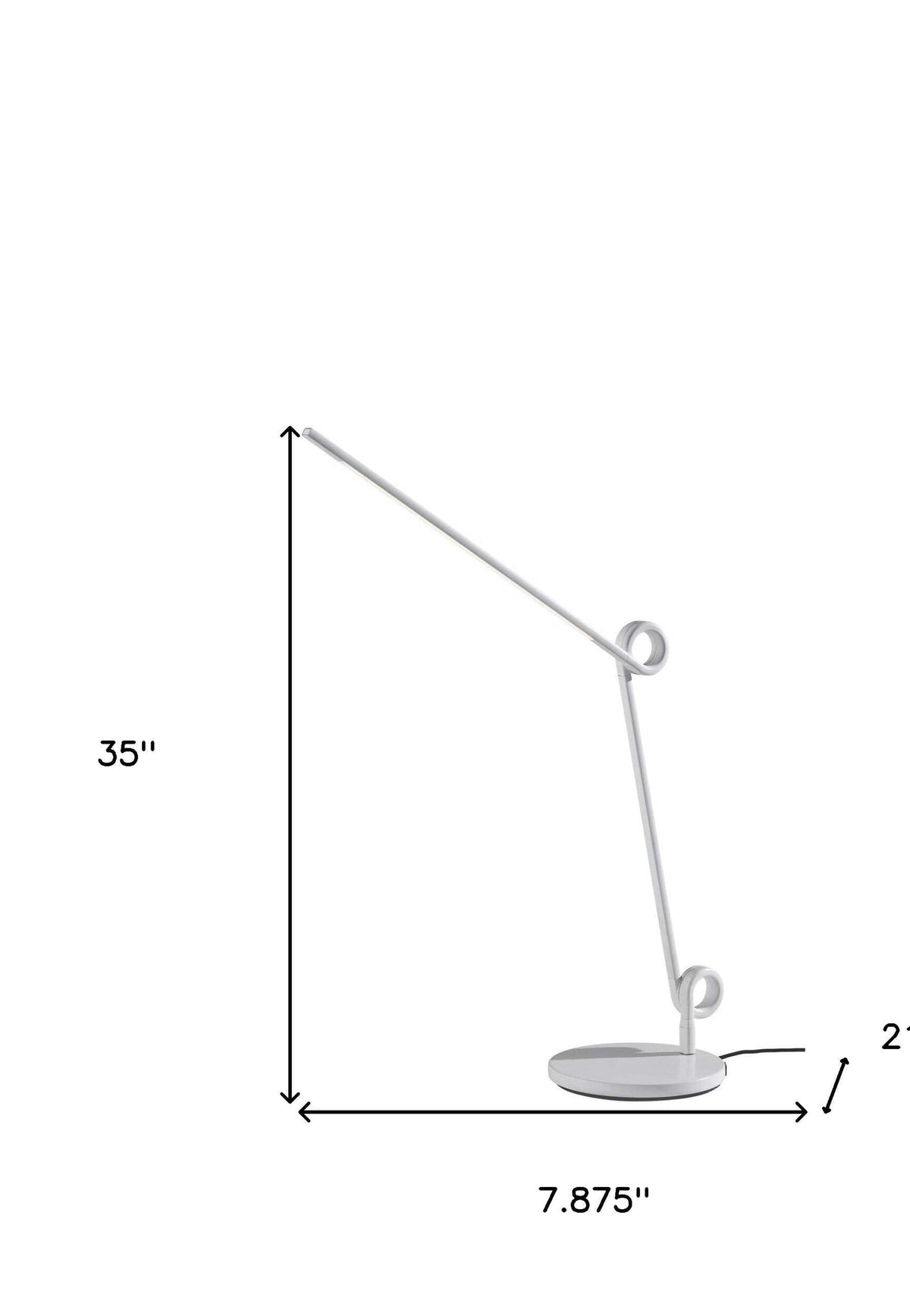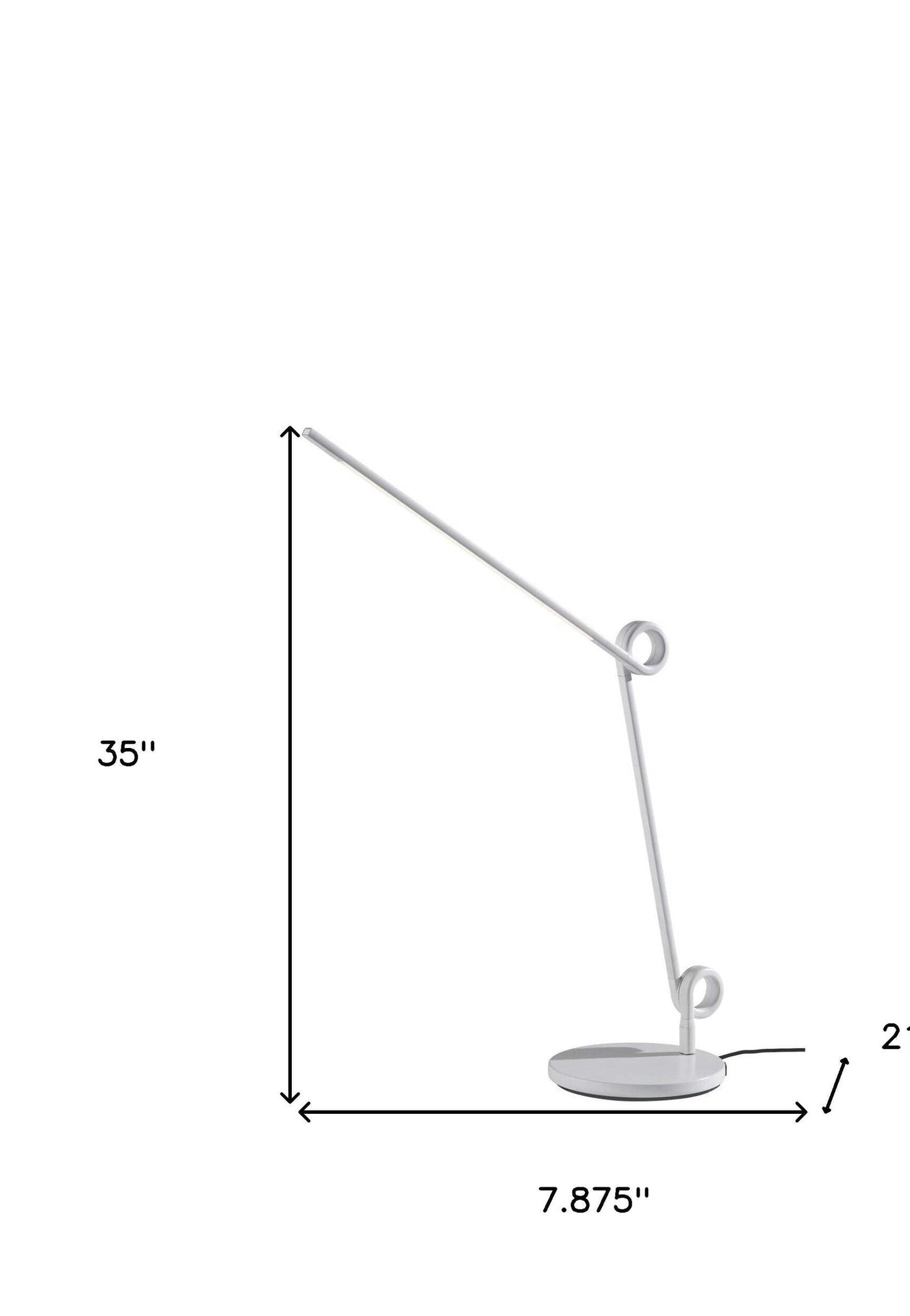 This 35inch white metal novelty desk led usb table lamp is a great way to add some brightness to any corner of your home. The base of this lamp is made of white metal. This desk lamp provides task lighting that will illuminate your working area for reading or writing. Integrated led technology is energy efficient and gives this lamp a cool and modern look the light that this lamp throws is soft and warm to elevate the look of most any space in your home. Bring some lite and good vibes into your space with this updated and stylishly designed lamp. Features. 35 Metal Novelty Desk LED USB Table Lamp. Lamp features a 4way touch switch for ease and convenience. For convenience, lamp includes a builtin USB port to charge compatible electronic devices. Includes LED technology that is not only energy saving but gives a fresh and updated look and design. This lamp is a high quality contemporary lighting solution for your desk, office, home office or study. Contemporary style table lamp with a truly unique and funky swirling design. Includes a 60 inch white fabric covered cordSpecifications. Color White. Size 35. Bulb Type Required Integrated LED. Bulb Count 1. Bulb Maximum Wattage 10. Voltage 120. Table Lamp Type Desk. Base Color White. Metal Type Steel. Integrated LED Yes. Fixture Material Metal. Switch Included Yes. Switch Type Touch. Lamp Shape Novelty. Base Material Metal. Bulb base G9/Bipin. Builtin USB Port Yes. Base Depth 7.875. Base Height 0.5. Base Width 7.875. Commercial Use Yes. Room Living Room. Cord Length 60. Style Contemporary. Assembly Required No Assembly Needed. Base Finish White. Finish Painted. Dimension 35 H x 7.875 W x 21.25 D. Weight 3.45 lbs
