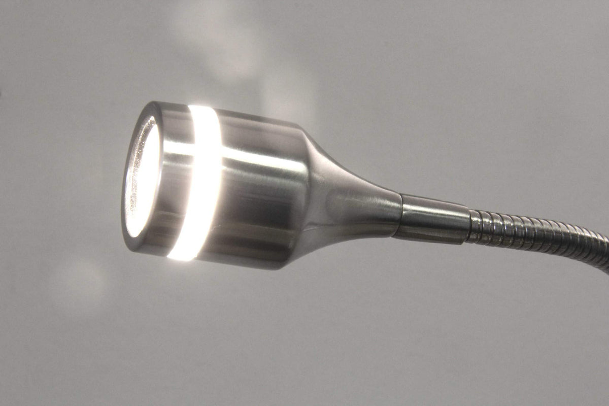 Save table or desk space with this LED floor lamp. The slim profile pumps out 250 lumens to illuminate any task, while the gooseneck extends the height or directs light where needed. The metal shade features a decorative light band accent and convex glass magnifier lens. Choose from versatile brushed steel or a matte black finish with a black fabric-covered cord.A rubber push switch located on the pole turns the lamp on and off. This lamp is smart outlet compatible. The LED light is integrated into the lamp and is not replaceable, but lasts 50,000 hours!