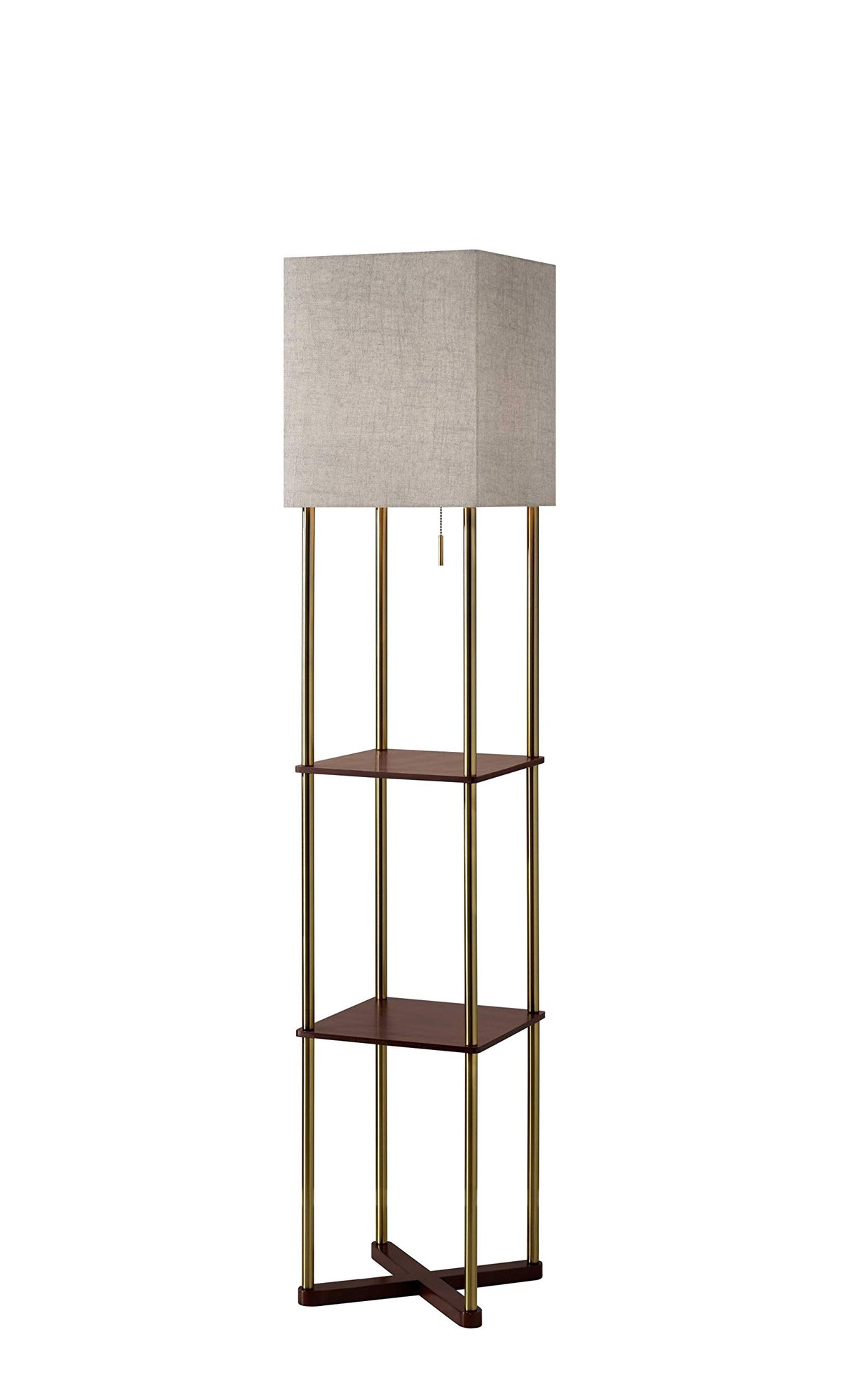Taking the classic shelf light to the next level this floor lamp mixes highquality materials to create an elevated functional design with a charging station and display shelves Antique brass poles hold 2 walnutfinished shelves and a square textured natural linen shade Conveniently located underneath the socket 2 USB ports can charge up your smart devices A decor ative metal pull chain turns the lamp on and off This lamp has a clear cord and is smart outlet compatible Features. Textured natural fabric shade. Durable construction for lasting use. Made with the finest material. 2 Usb ports located underneath the socketSpecifications. Color Antique Brass Walnut. Material Wood